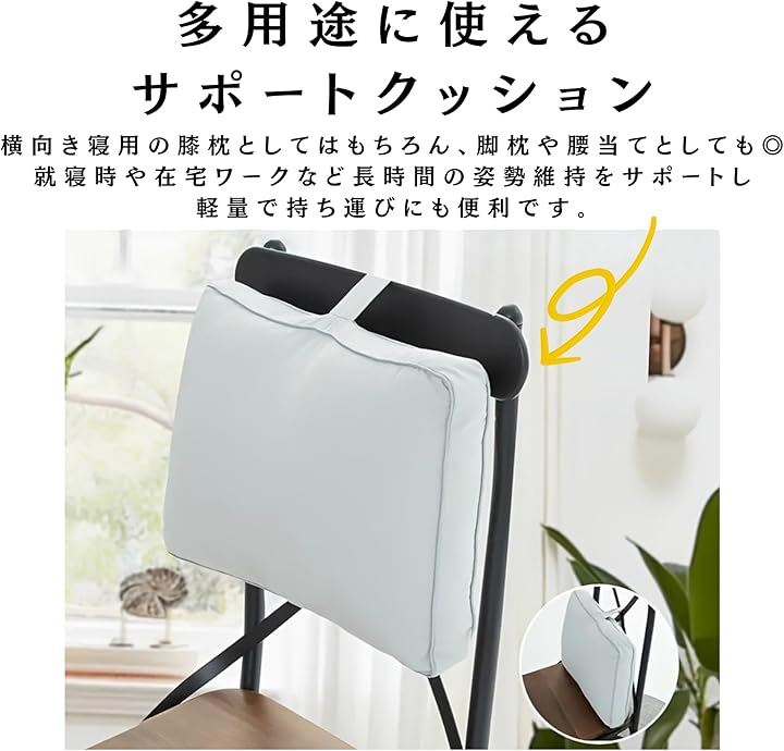 「多用途に使えるクッション」横向き寝のための膝枕としてはもちろん、脚の下に挟んで脚枕として使用したり、椅子の背もたれに当てて腰の支えにしたりと、シーンに応じて幅広く活用できます。