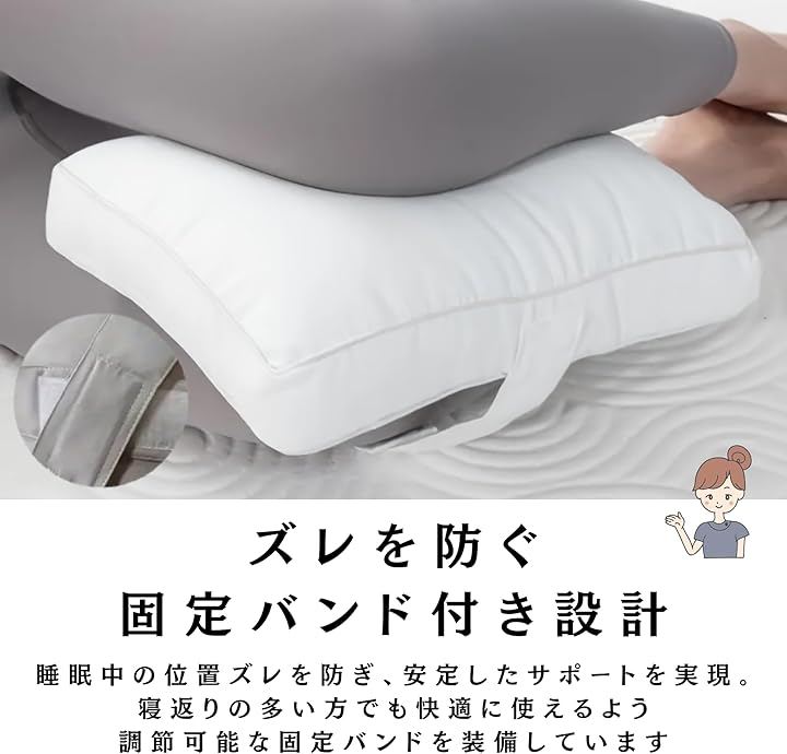 「ズレを防ぐ固定バンド付き設計」寝返りの多い方でも快適に使えるよう、クッション本体に調節可能な固定バンドを装備しています。