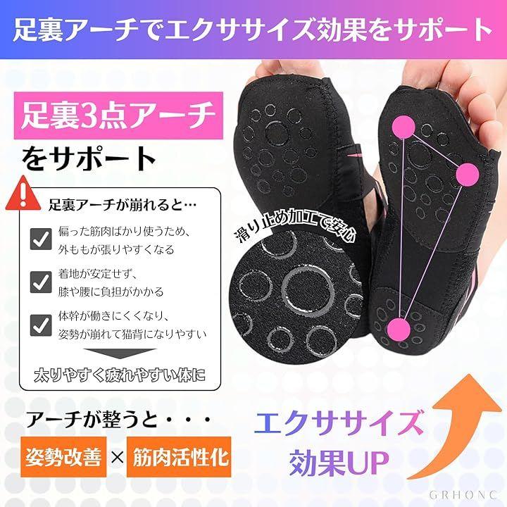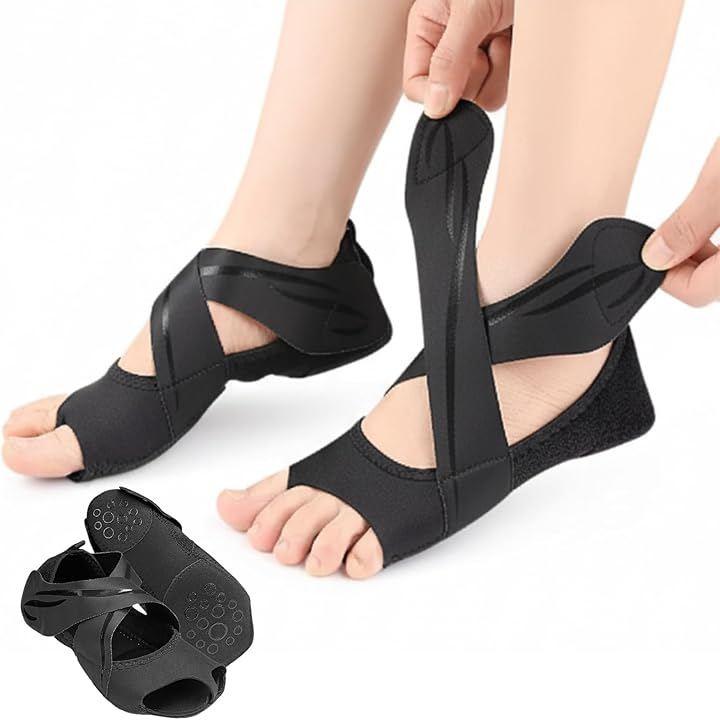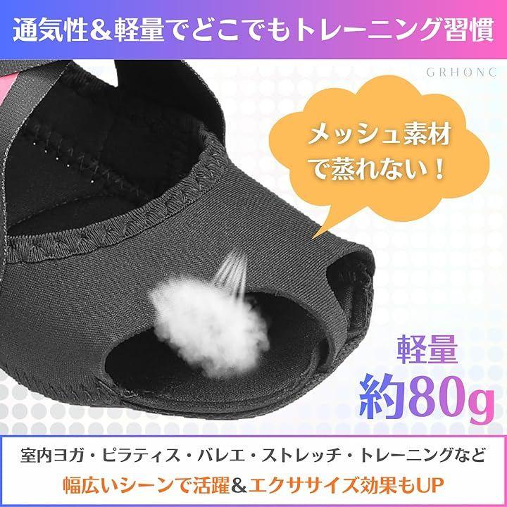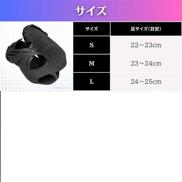 「カラー」ブラック「サイズ」S(22~23cm)・M(23~24cm)・L(24~25cm)「素材」ライカ弾性布+潜水料ソール+PU補強「重量」約76g「機能」滑り止め・調整可能クロスベルト・オープントゥ・衝撃吸収パッド「用途」ヨガ・ピラティス・バレエ・ダンス・室内トレーニング・リカバリー・姿勢サポート