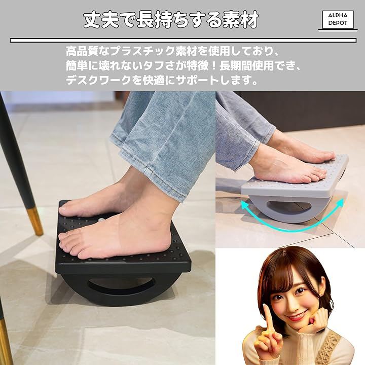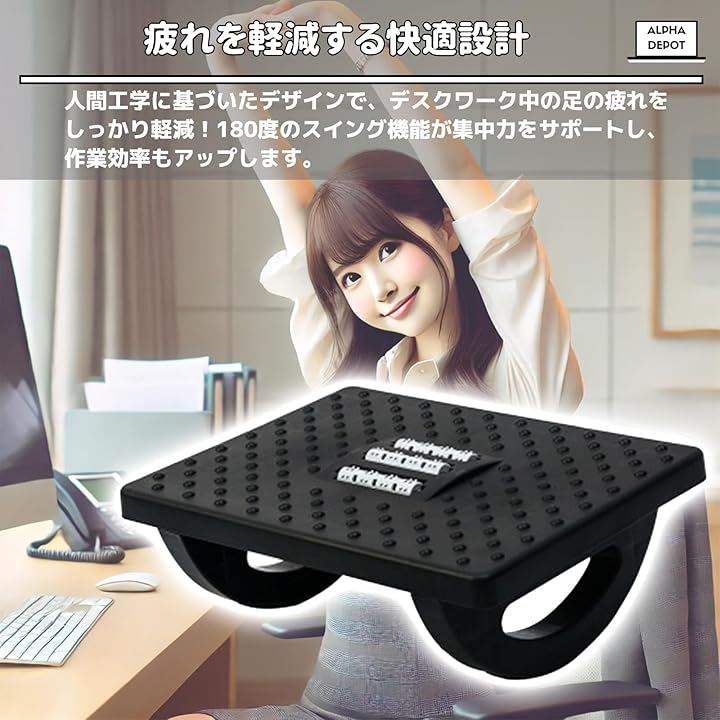 「疲れを軽減する快適設計」人間工学に基づいたデザインで、デスクワーク中の足の疲れをしっかり軽減。180度のスイング機能が集中力をサポートし、作業効率もアップします。