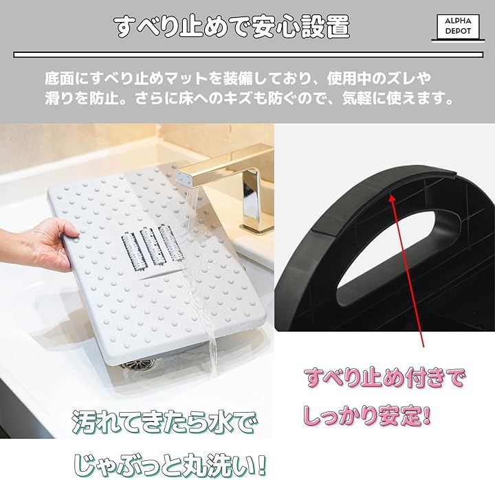 「すべり止めで安心設置」底面にすべり止めマットを装備しており、使用中のズレや滑りを防止。
