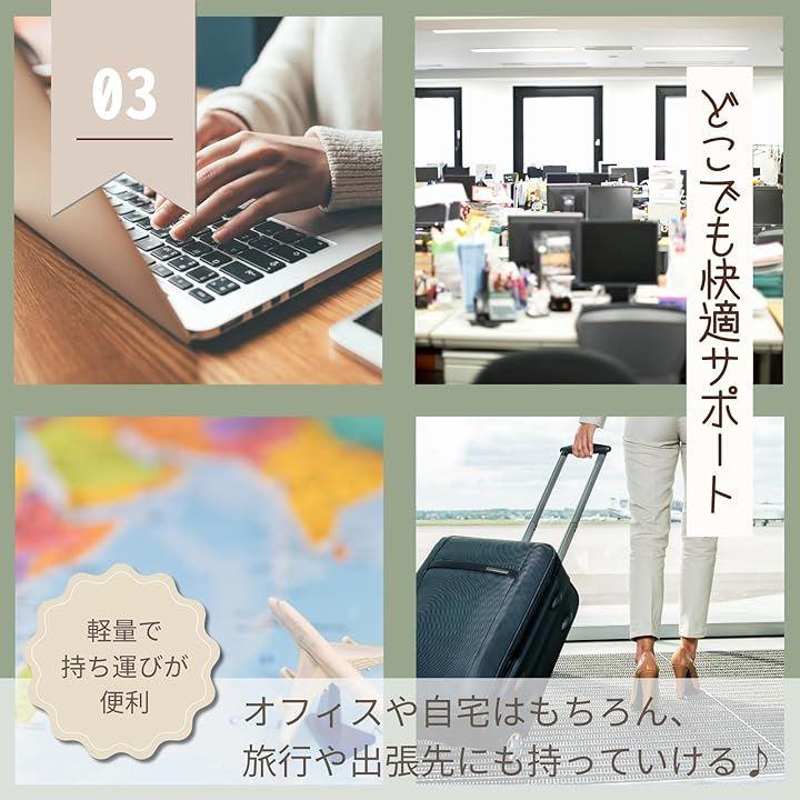 「軽量で持ち運びが便利」軽量設計で、オフィスや自宅はもちろん、旅行や出張先でも簡単に持ち運びができ、どこでも手軽に快適さを享受できます。