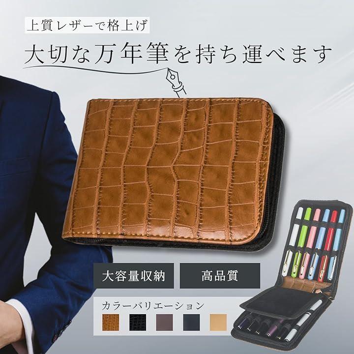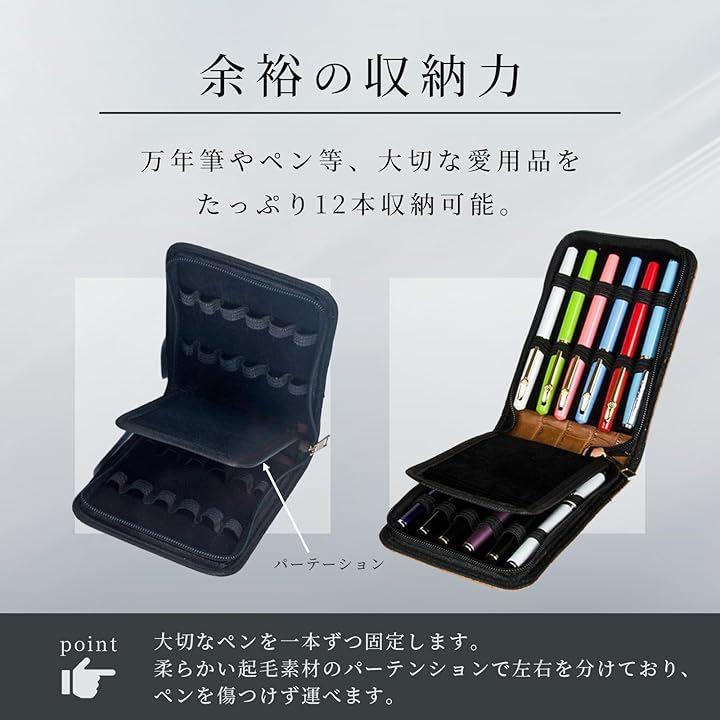 「特徴」この万年筆入れは12本収納可能なペンケース内部は 一本ずつにゴムバンドがついており隣のペンとの接触をふせぎ、大切な万年筆を守ります。