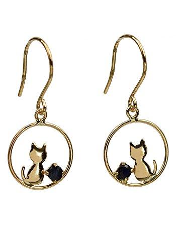 Four-Leaf Clover Sapphire Cat Hook Earrings, 10k Yellow Gold, September Birthstone, Cat Earrings for Women