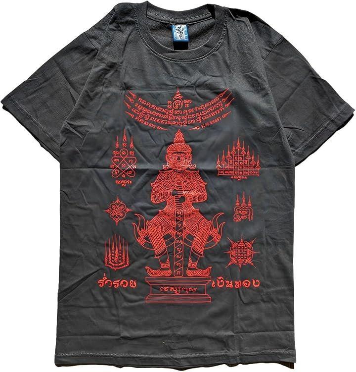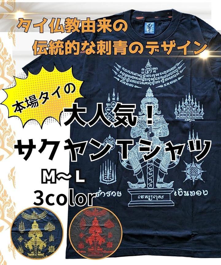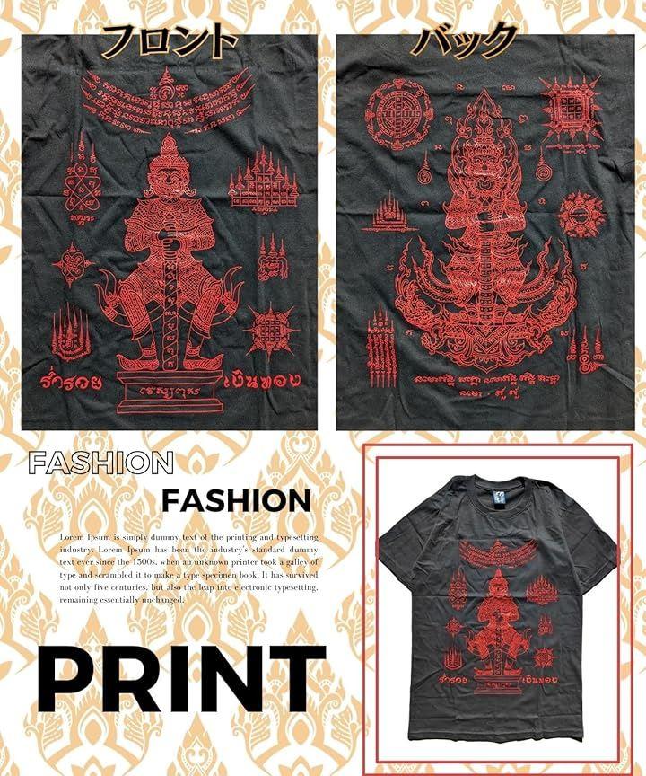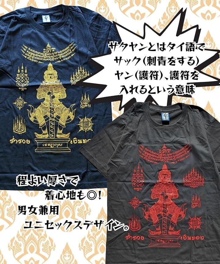 タイ仏教由来の伝統的な刺青のデザイン、サクヤンがプリントされたTシャツです サクヤンとはタイ語でサック(刺青をする)ヤン(護符)、護符を入れるという意味 現地では寺院で僧侶(お坊さん)が行っている伝統のタトゥー(刺青)。