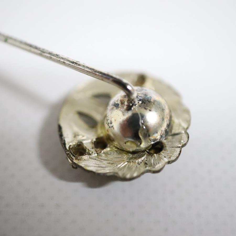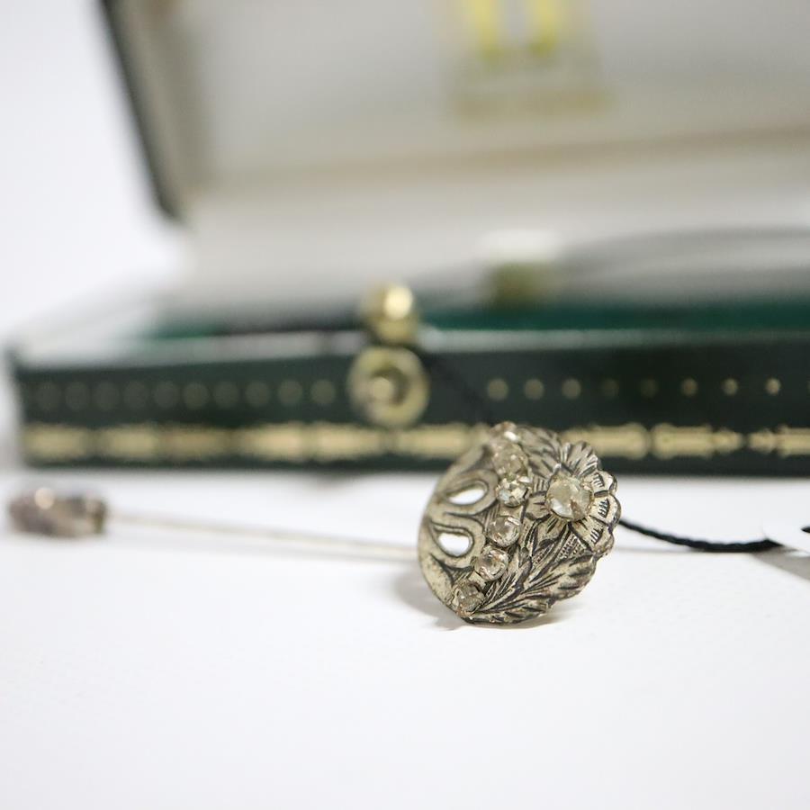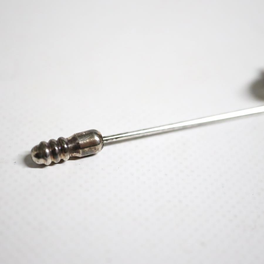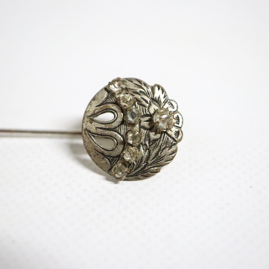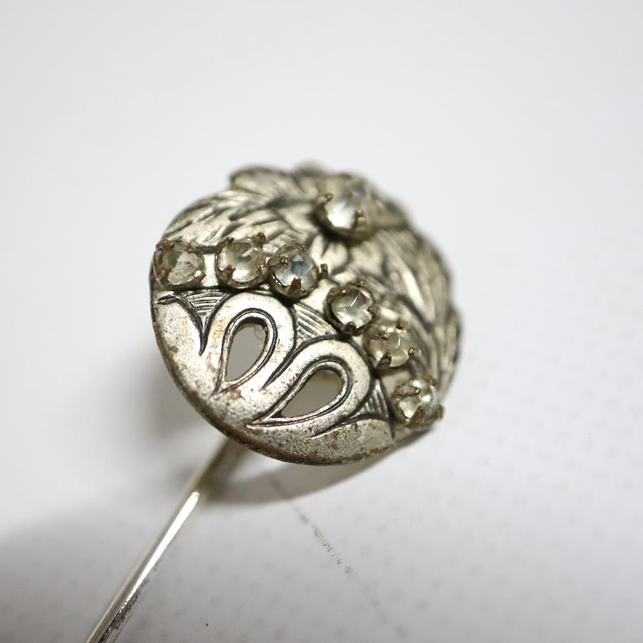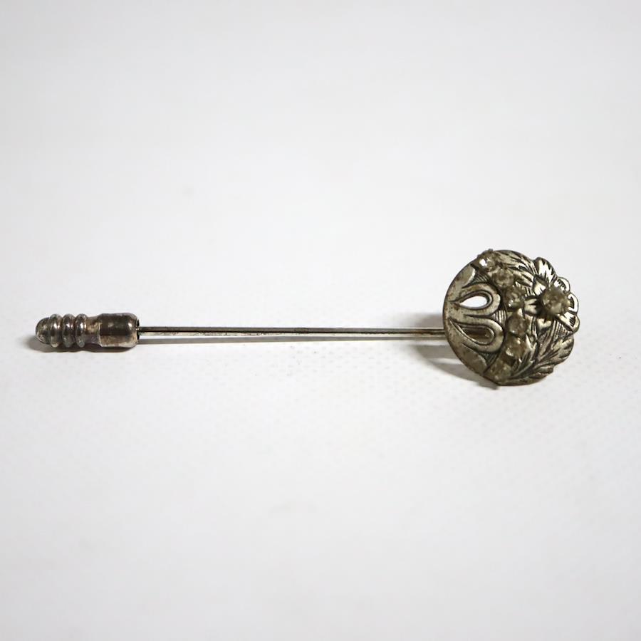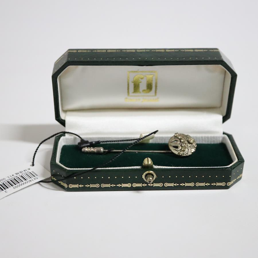 スーツの襟元を上品に演出できるFRANCO JACASSIのラペルピンです。アンティーク調の装飾とラインストーンがアクセントになり、フォーマルシーンや式典にも合わせやすいデザインです。