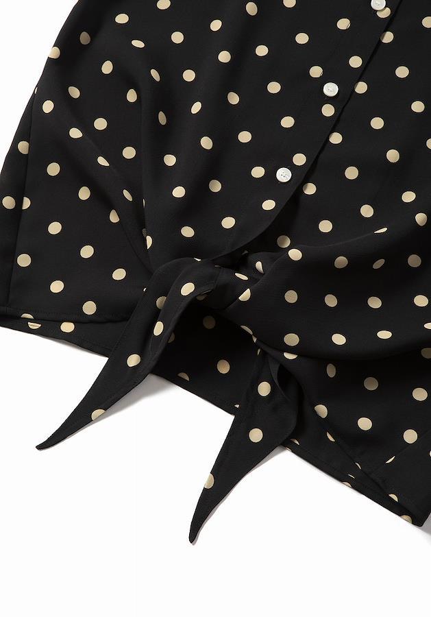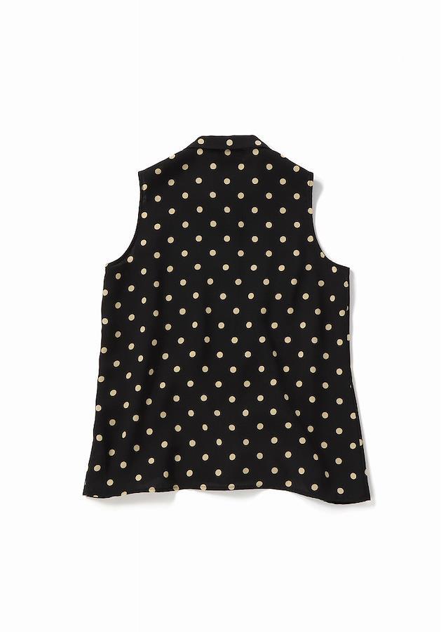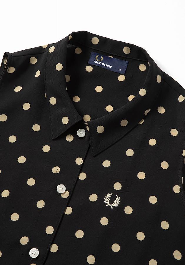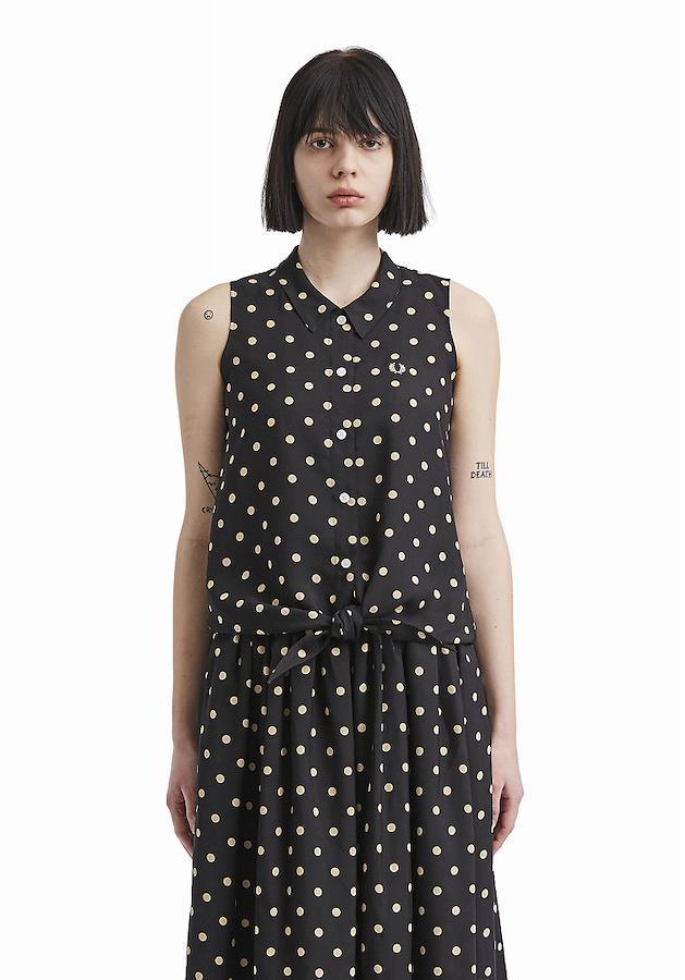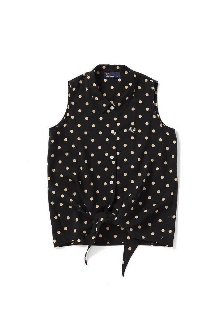 【DETAIL】・ウエストで裾を結ぶデザインのノースリーブシャツ。・フレッドペリーM12の代表配色ブラック×シャンパンを採用したドットプリントのツイル素材を使っています。・Polka Dot Skirt(F8486)とのセットアップもおすすめです。