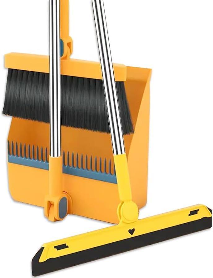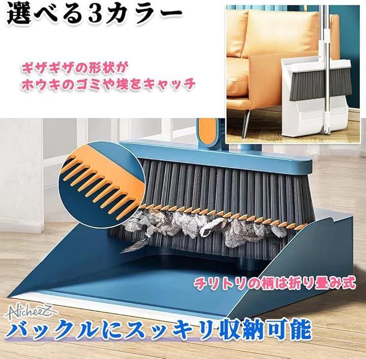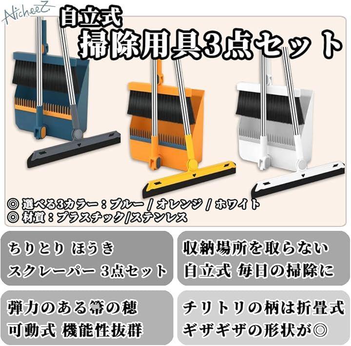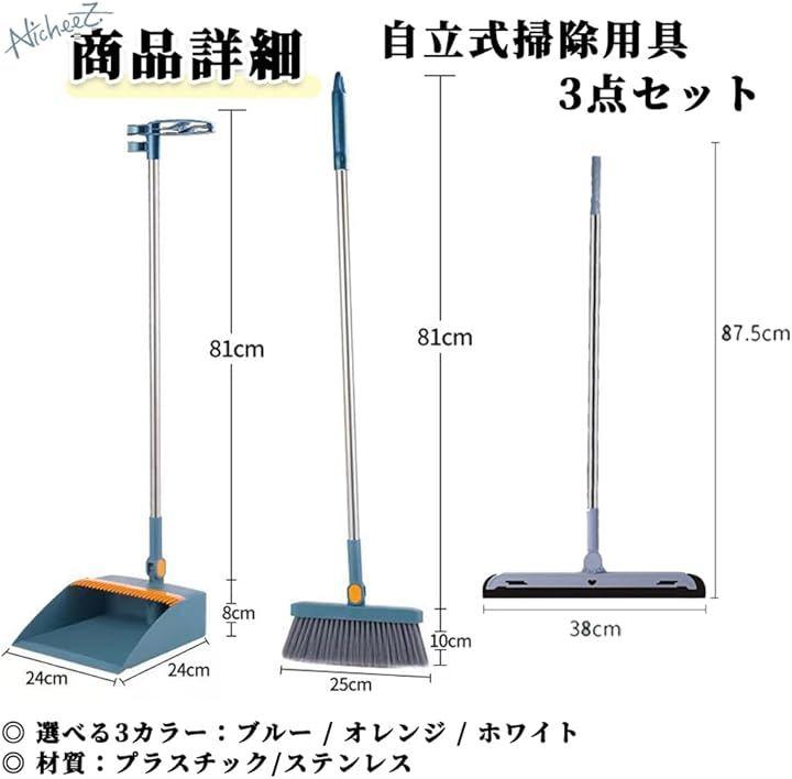 「商品内容」 自立式掃除用具3点セット 材質:プラスチック/ステンレス カラー:ブルー/オレンジ/ホワイト サイズ:ちりとり柄の長さ/約81cm 幅/約24cm 奥行き/約24cm 高さ/約8cm ほうき柄の長さ/約81cm 幅/約25cm ブラシの長さ/10cm