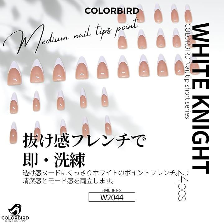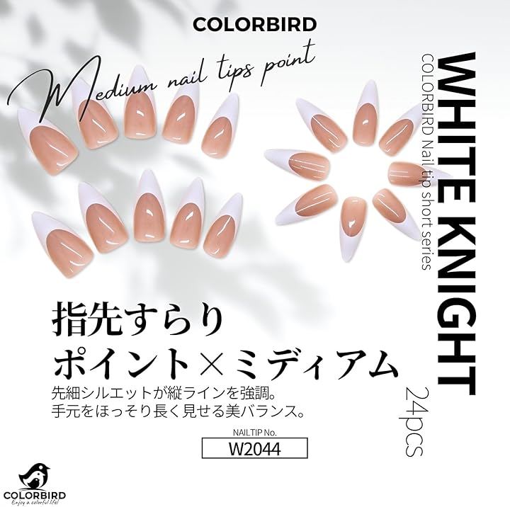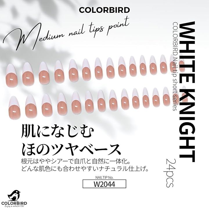 ミディアムポイント型のフレンチネイルチップは、ヌードベースに純白のラインが映える王道デザイン。