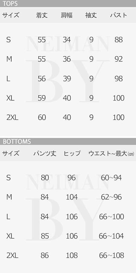 サイズ: 「トップス」着丈/肩幅/袖丈/バスト 「S」55/34/9/88「M」55/36/9/92 「L」56/39/9/98 「XL」59/40/9/100「2XL」60/40/9/100 「パンツ」パンツ丈/ヒップ/ウエスト~最大(cm) 「S」80/96/60-94「M」84/104/62-96「L」84/106/66-100 「XL」85/106/66-104「2XL」86/108/66-108