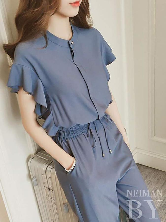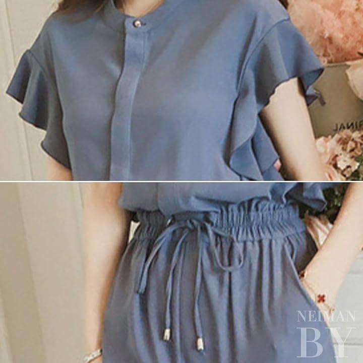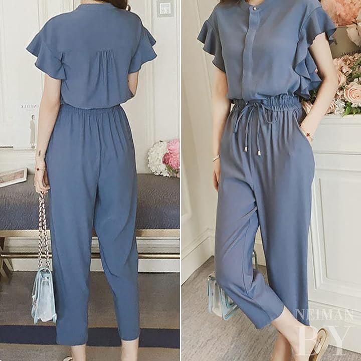French sleeve set, ruffle sleeves, top and bottom set, 9/10th length, pants dress, suit, loungewear, thin, formal, plain, simple, roomwear, cute, stylish, 1S-N20-BLL