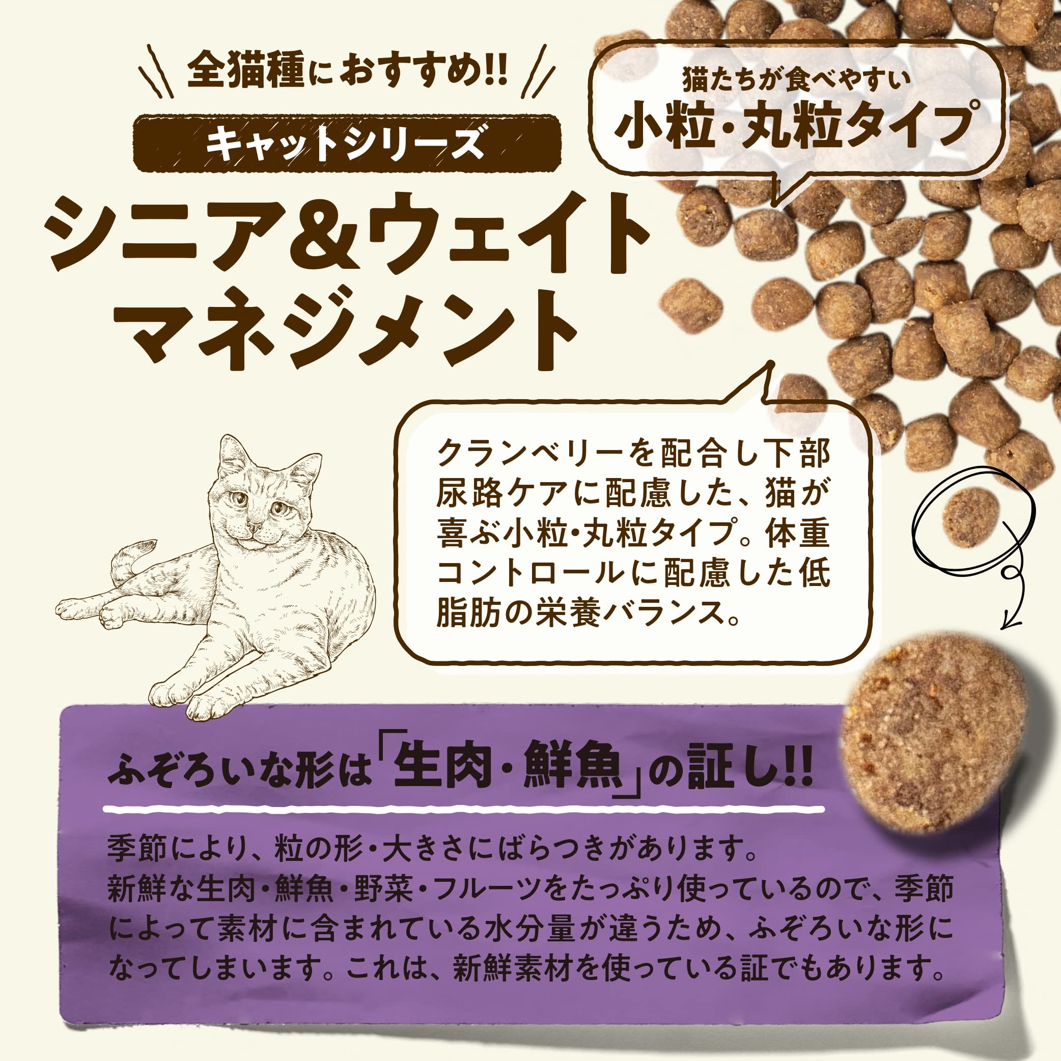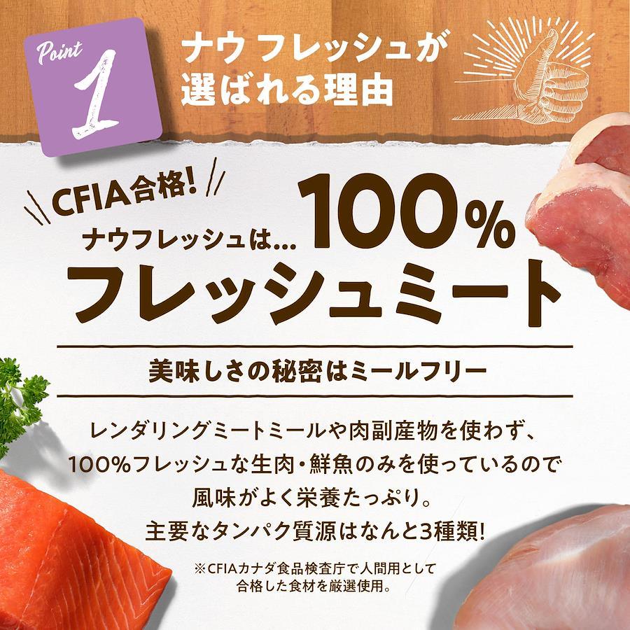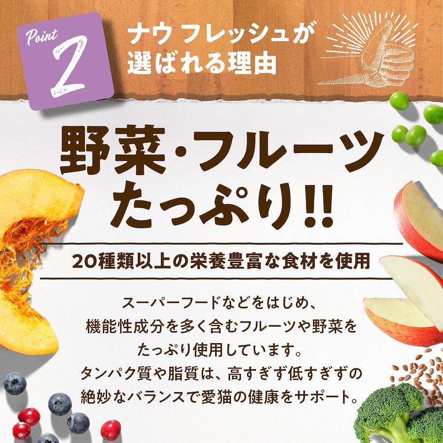 【新鮮という品質をお届け】ナウフレッシュは、家族の大切な一員である愛犬のために、トコトン新鮮にこだわったナチュラル×ミールフリーのプレミアムフードです。【新鮮な生肉・鮮魚を使用した低脂肪/低リンフード】シニア・体重管理に適した低脂肪/低リンのキャットフードです。消化にやさしく美味しい、生(フレッシュ)の食材にとことんこだわり、乾燥肉やミートミールを使わない「100%」新鮮な生肉・鮮魚を使っています。グルコサミン・コンドロイチン配合で関節にも配慮しています。【フルーツ・野菜たっぷり!20種類以上の食材を使用】 多彩な食材の組み合わせで美味しさと栄養バランスを整えることを目指しています。低温調理でゆっくり丁寧に素材の持ち味を生かし、食いつきがよく、食べ飽きない美味しさです。【大切な猫ちゃんに安心・安全のフード】人工添加物(合成保存料・香料・着色料)不使用、グルテンフリー、グレインフリーで、体にやさしい安心のフードです。【シニア/体重管理用・丸粒タイプ】食べやすく消化にやさしい丸粒タイプです。新鮮素材を使用しているため、季節によって粒の形・大きさにばらつきがあります。