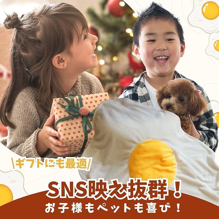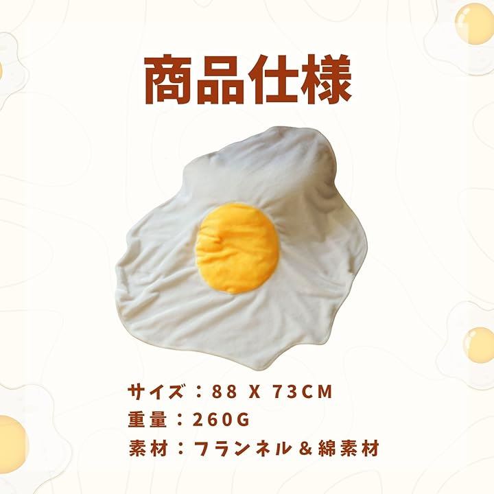 「目玉焼き おもしろ ブランケット 仕様」 *サイズ:たて88cmxよこ73cm *重さ:260グラム *素材:フランネル、綿 *モニターの環境により、色の見え方に若干差が生じる場合がございます。