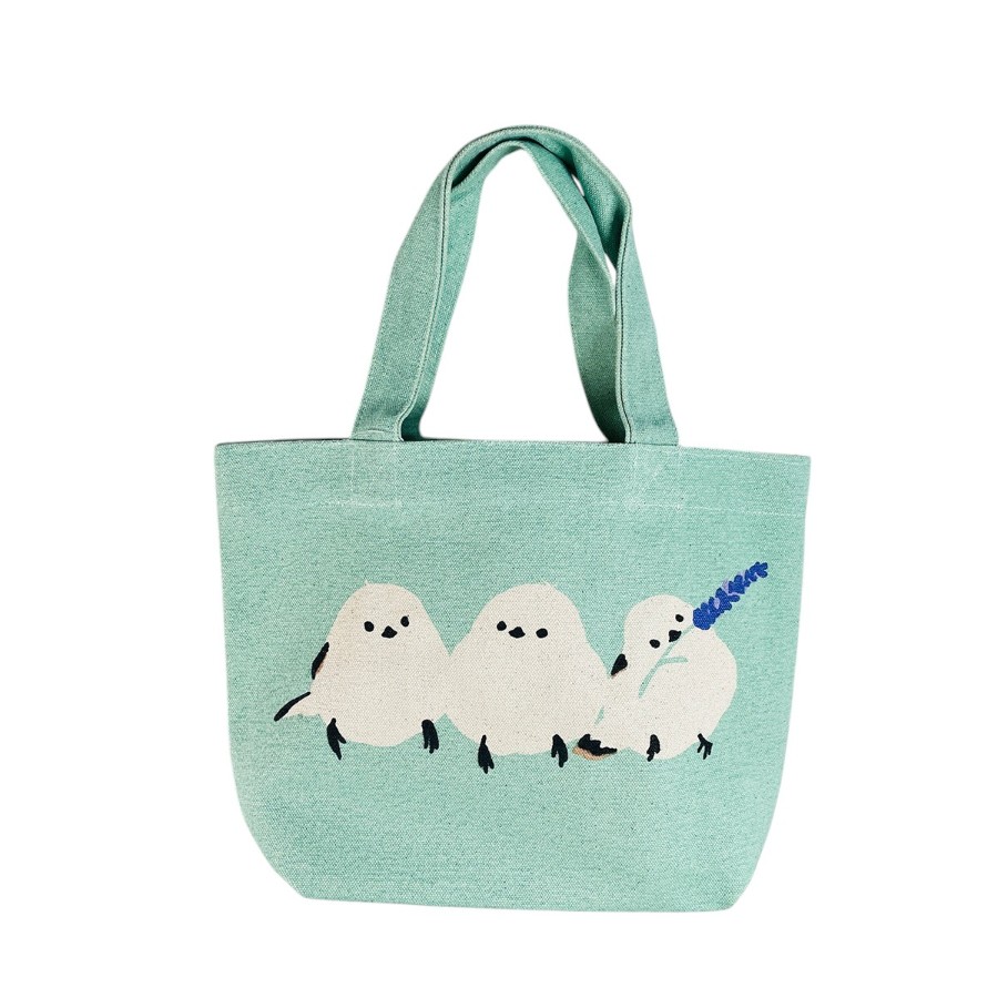 北海道に住むもふもふの鳥「シマエナガ」のかわいいミニトートバッグです。ランチバッグとして、お散歩バッグとしてちょうど良いサイズ。