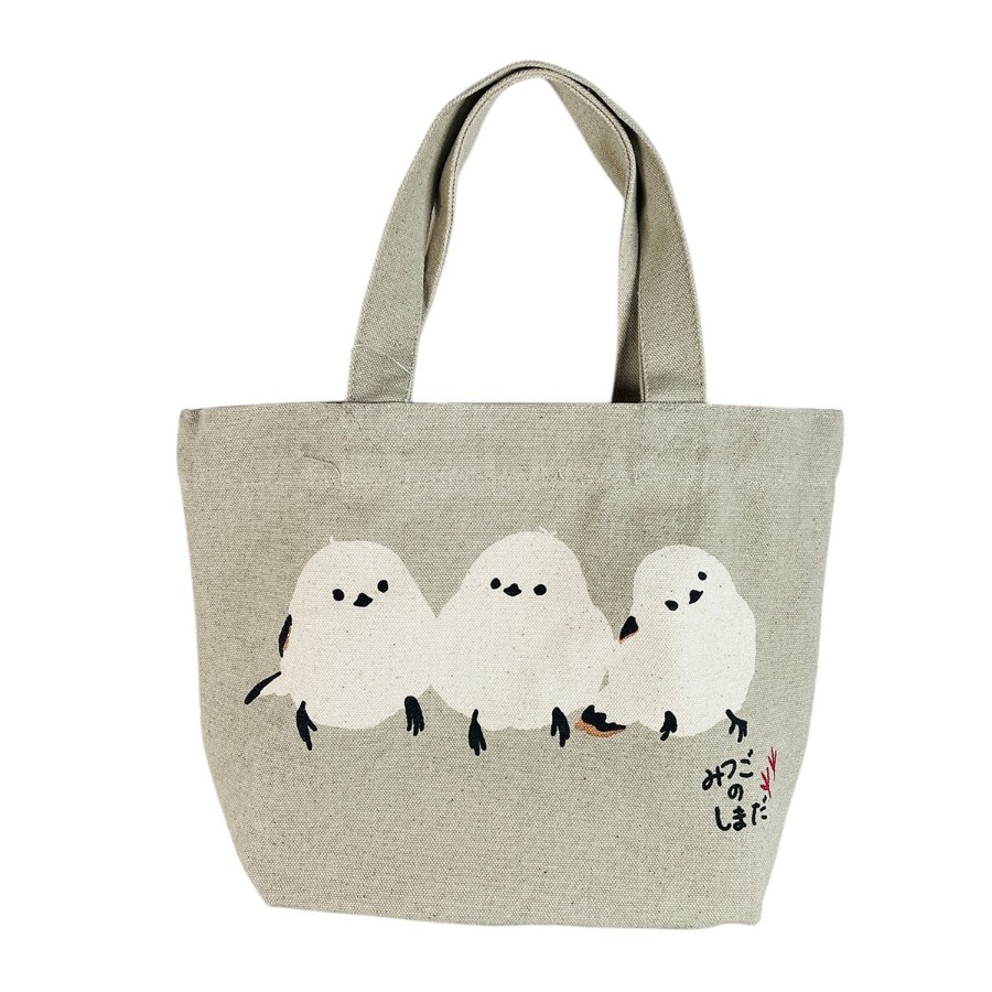 北海道に住むもふもふの鳥「シマエナガ」のかわいいミニトートバッグです。ランチバッグとして、お散歩バッグとしてちょうど良いサイズ。