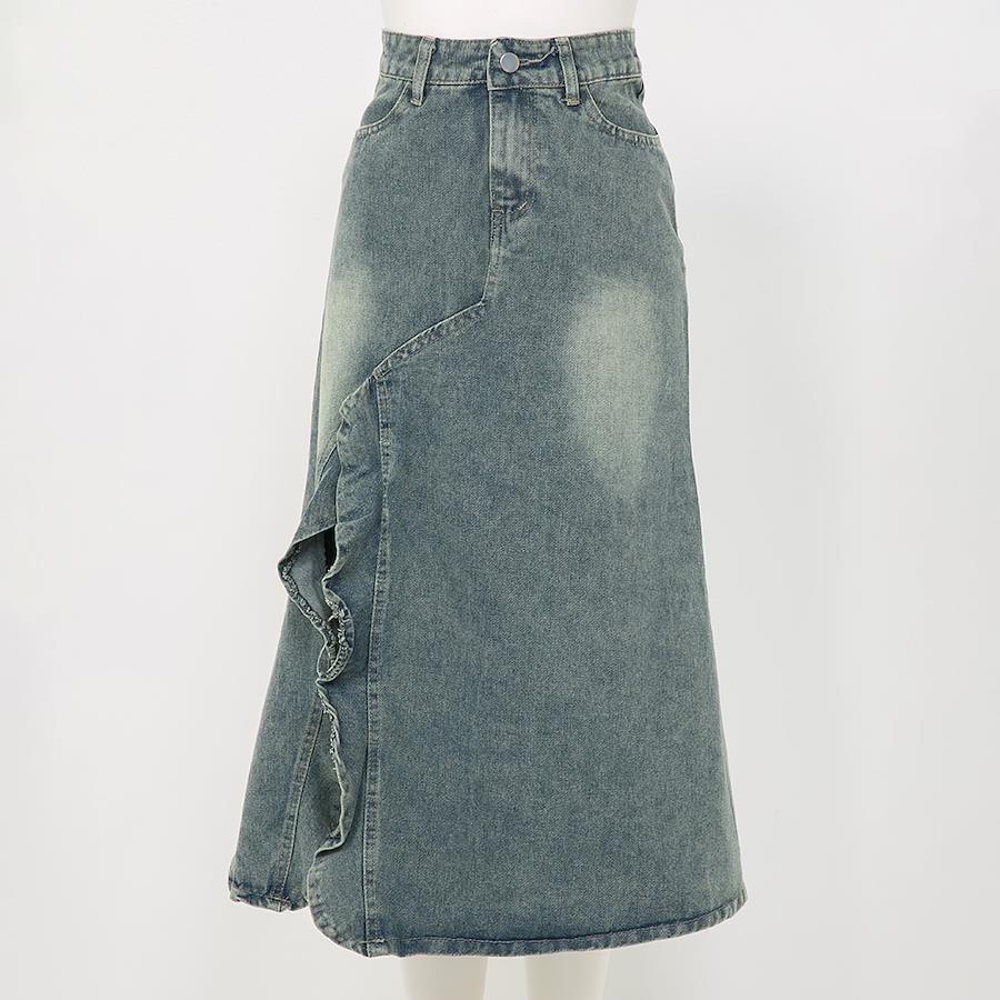 フリルスリットデニムスカートのデザインは、カジュアルさとフェミニンさを融合させたものです。
