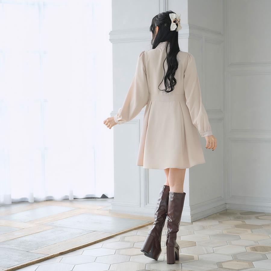 プチフリルをあしらったスタンドカラーが上品なデザイン。