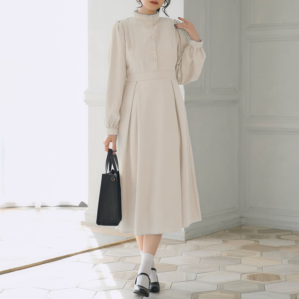 プチフリルをあしらったスタンドカラーが上品なデザイン。