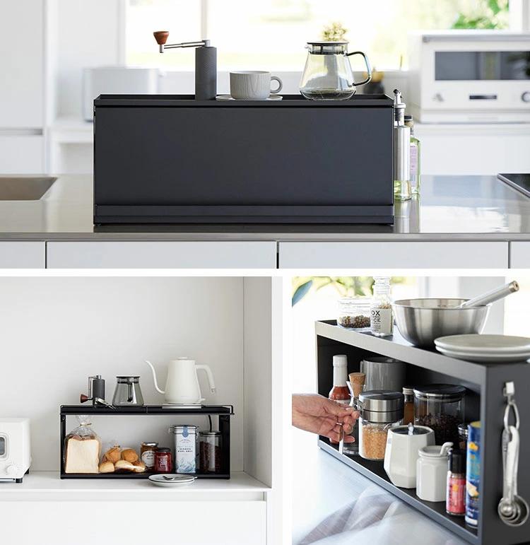 【前が開くキッチンカウンター上収納ラック D15】リビングからはスッキリ隠せて、キッチンからは使い勝手の良さが嬉しい。奥行き15cmのカウンター上収納ラックです。リビング側は全面が開くフラップ式の扉なので、中の物も取り出しやすいです。キッチン側は扉がないのでサッと物の出し入れがしやすいです。壁際に設置すればブレッドケースとしても使用できます。スチール製なのでマグネットが付き便利です。