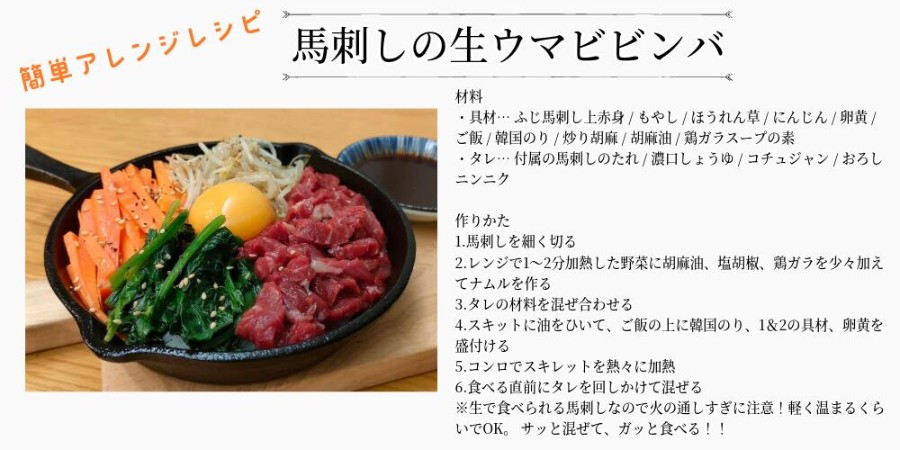 | 原材料名 | 馬肉 ユッケのたれ原材料:醤油(国内製造)、糖類(砂糖混合異性化液糖、砂糖)、本みりん、食塩、コチジャン、清酒、にんにく加工品、食用ごま油、香辛料/アルコール、増粘多糖類、(一部に小麦・大豆・ごまを含む) |