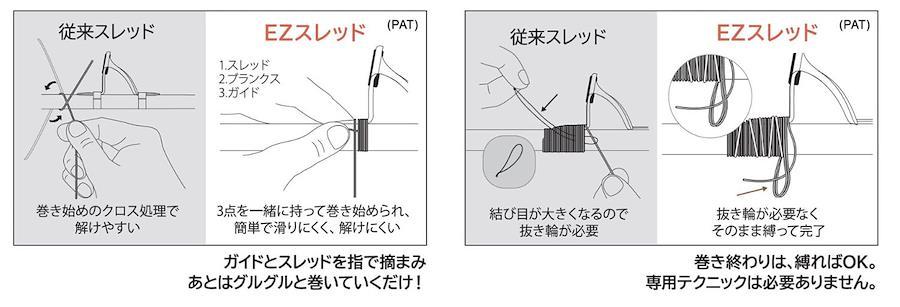お気に入りの竿をDIY。究極に簡単なガイドラッピング。誰でも簡単にガイドを巻けるEZスレッド。ロッドに巻き付けテンションを掛けると潰れて帯状になる、しなやかなスレッド。ブランクスやガイドの上でも滑りにくい素材。この2つの特性が、ガイドの巻き方を根本から革新させました。誰でも気軽にガイドラッピングを楽しめます! EZスレッドは初心者がランダムに巻いても、隙間や凸凹が少ないラッピングが簡単に可能。経験者でも苦労するガイド足先端部分も巻き下がる事でEZラッピング! 使い方はガイドとスレッドを指で摘まんだら、あとはグルグルと巻いていくだけ! 巻き終わりは縛ればOK。専用テクニックは必要ありません。初心者のみならず、上級者のミニクロガイドラッピングにも対応。
