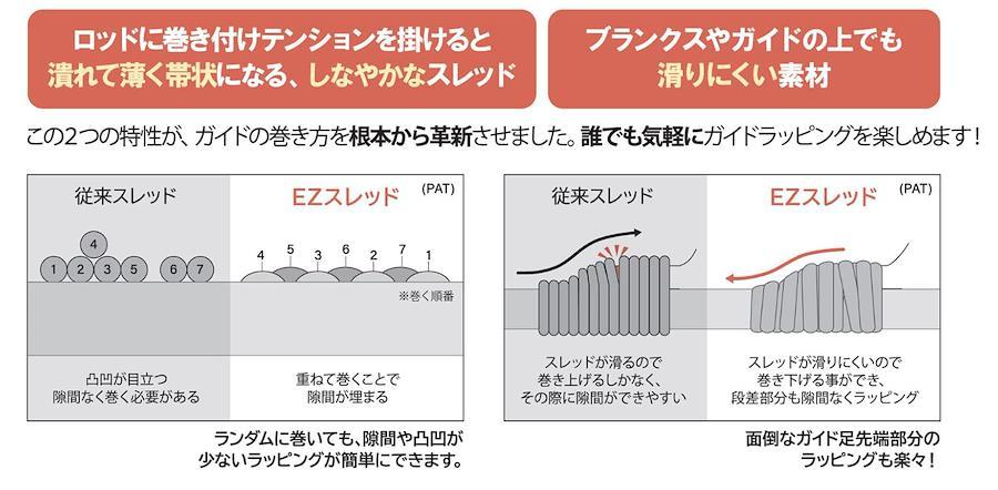 お気に入りの竿をDIY。究極に簡単なガイドラッピング。誰でも簡単にガイドを巻けるEZスレッド。ロッドに巻き付けテンションを掛けると潰れて帯状になる、しなやかなスレッド。ブランクスやガイドの上でも滑りにくい素材。この2つの特性が、ガイドの巻き方を根本から革新させました。誰でも気軽にガイドラッピングを楽しめます! EZスレッドは初心者がランダムに巻いても、隙間や凸凹が少ないラッピングが簡単に可能。経験者でも苦労するガイド足先端部分も巻き下がる事でEZラッピング! 使い方はガイドとスレッドを指で摘まんだら、あとはグルグルと巻いていくだけ! 巻き終わりは縛ればOK。専用テクニックは必要ありません。初心者のみならず、上級者のミニクロガイドラッピングにも対応。
