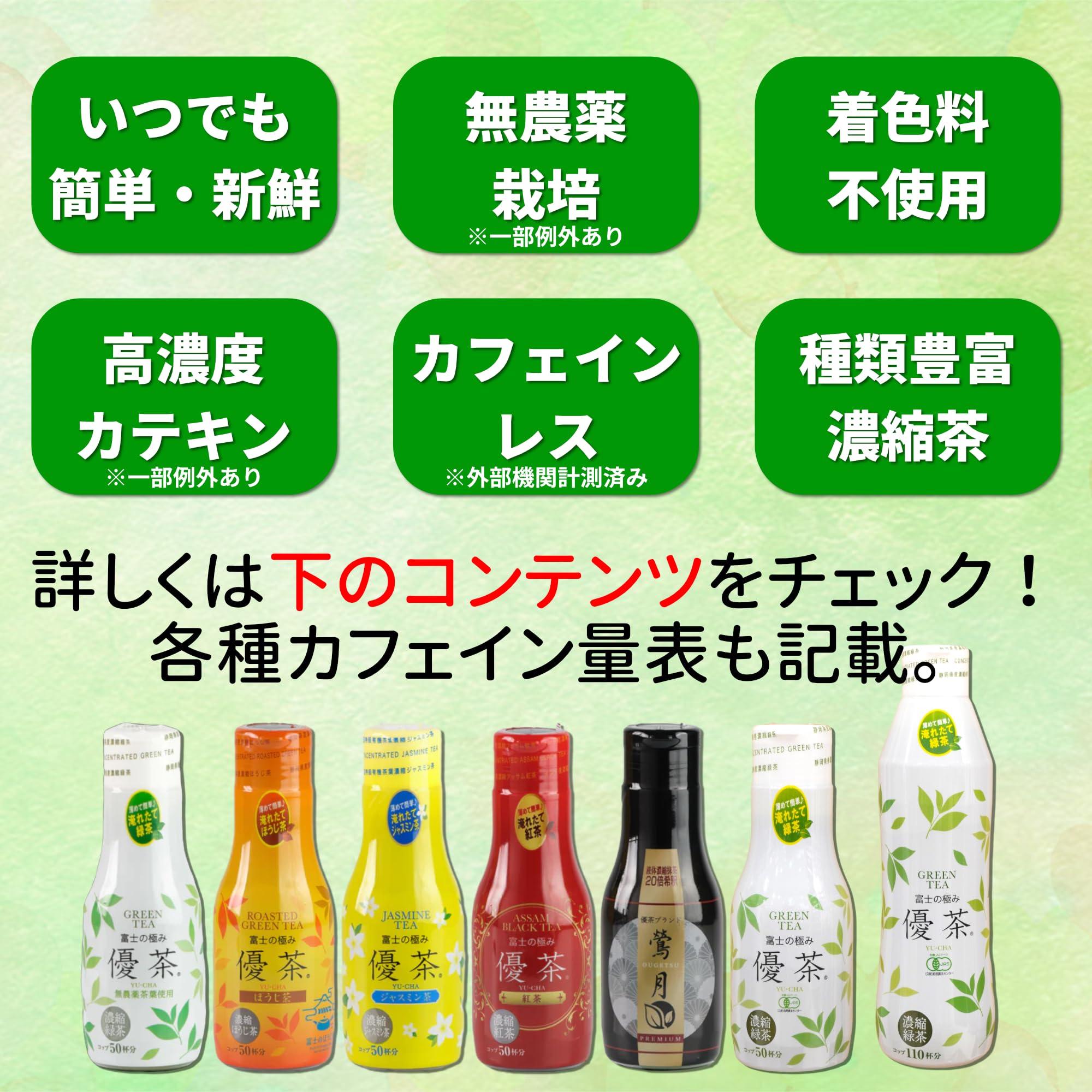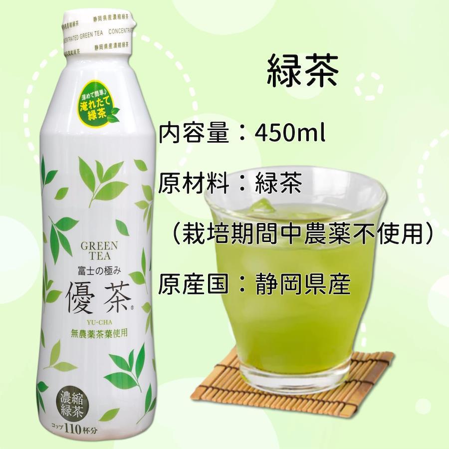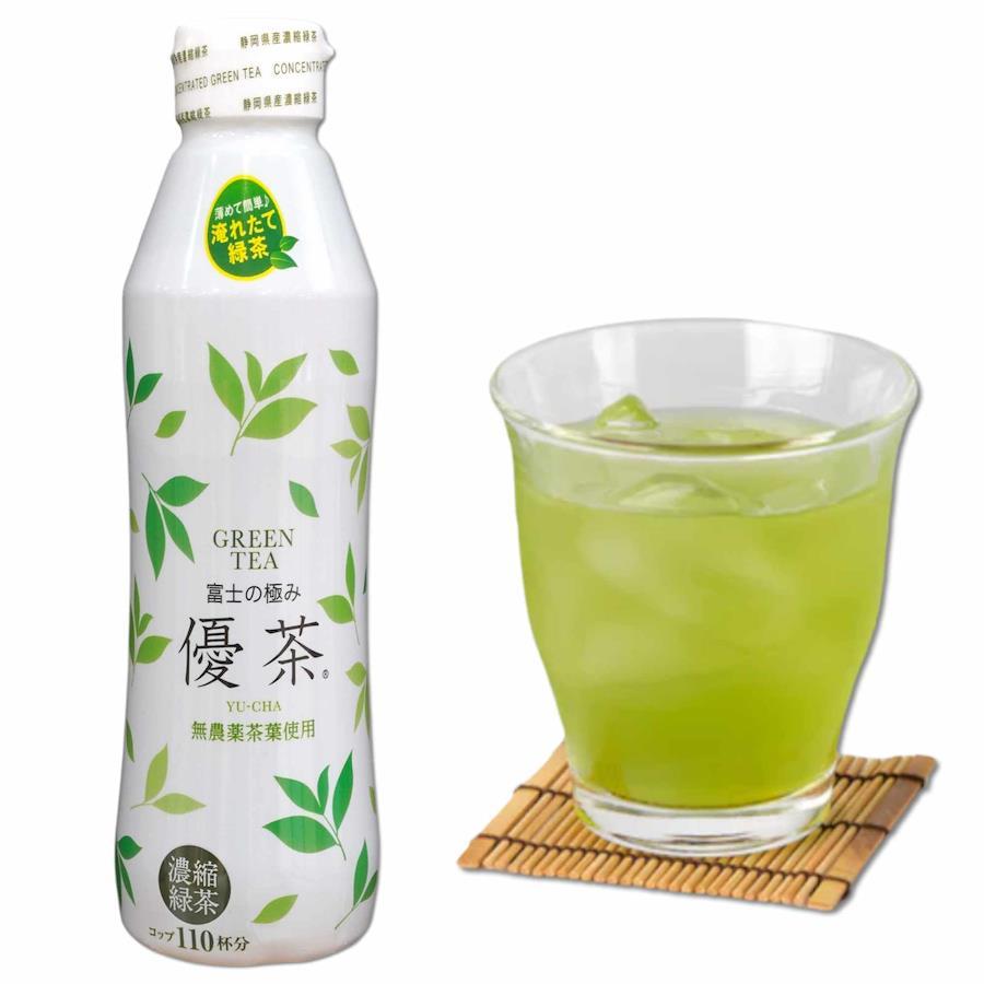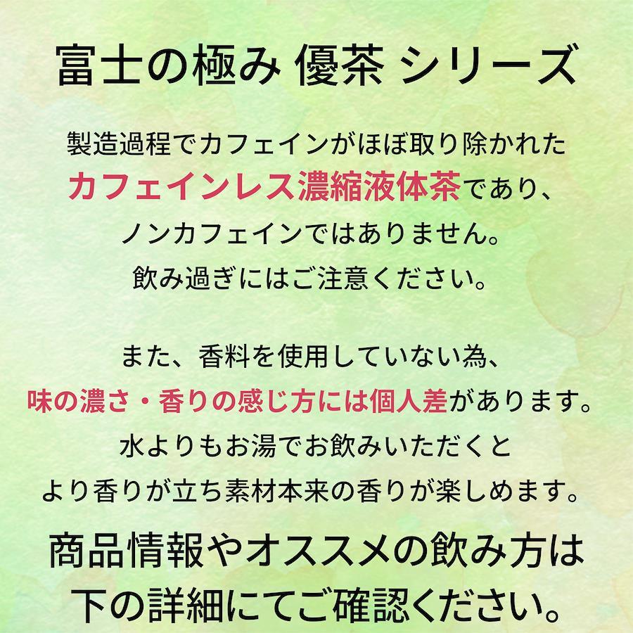 【商品情報】下の項目をご覧ください。※味の濃さ・香りにおいて香料を使用してない為、個人差はありますが薄く感じる場合がございます。【富士の極み優茶シリーズについて】①茶葉の有効成分を「まるごと」美味しく摂取していただくために特許技術で茶葉の旨み・甘みを逃すことなく、添加物に頼らない天然由来成分で濃縮(無添加・無着色)。無農薬や素材にこだわり、薄めても成分そのままに飲むことができます。②1本で約110杯分作れます。(本製品4mlを120mlの水で薄めた場合)濃縮茶だから濃くしたり、薄めたり、自分好みの味でアレンジもできます。③体に優しいカフェインレスの濃縮茶は、身体の状態を気にかけている方、ご妊娠・授乳中の方、小さなお子様からお年寄りまで幅広い世代の方に安心してお召し上がりできます。(外部機関カフェイン量計測済み)④茶に含まれる高濃度カテキンは体の状態を気にかけている敏感な方にもおすすめです。⑤真空プッシュボトル(エアレスハクリボトル)採用で開封後も空気に触れにくく、茶殻・茶粉が出ないサラサラとした液体濃縮(リキッド)賞味期限は約2年近く長持ちします(未開栓の場合)⑥液体だから急須を使用せず、水やお湯を注ぐだけで、栄養をまるごと簡単にいつでも新鮮なお茶が楽しめます。お茶っ葉が出ないので面倒な後片付けもなくゴミも出ません。⑦マイボトルを使用し茶を作ることで、本来捨てられてしまうペットボトルを削減し、環境にも優しい優茶です。⑧商品詳細:【シリーズ】富士の極み 優茶、【サイズ】H約22.0×W約6.5cm、【素材】緑茶、【内容量】450ml、【原産国】静岡県産、【カフェインタイプ】カフェインレス、【化粧箱】なし【ご使用上の注意点】:高温場所を避けて暗所に保管してください。開栓後は冷蔵庫に保管し、お早めにお召し上がりください。茶葉に由来する成分が浮遊、沈澱する事がありますが、品質には問題ありません。【ご購入に関するお願い】仕様が予告なしに変更する場合がございます。お使いのモニターにより、実際の商品と色味が異なる場合がございます。【免責事項】メーカーによる商品リニューアルに伴いパッケージ(内容量も含む)変更が行われた場合、新パッケージでお届け致します事ご了承願います。