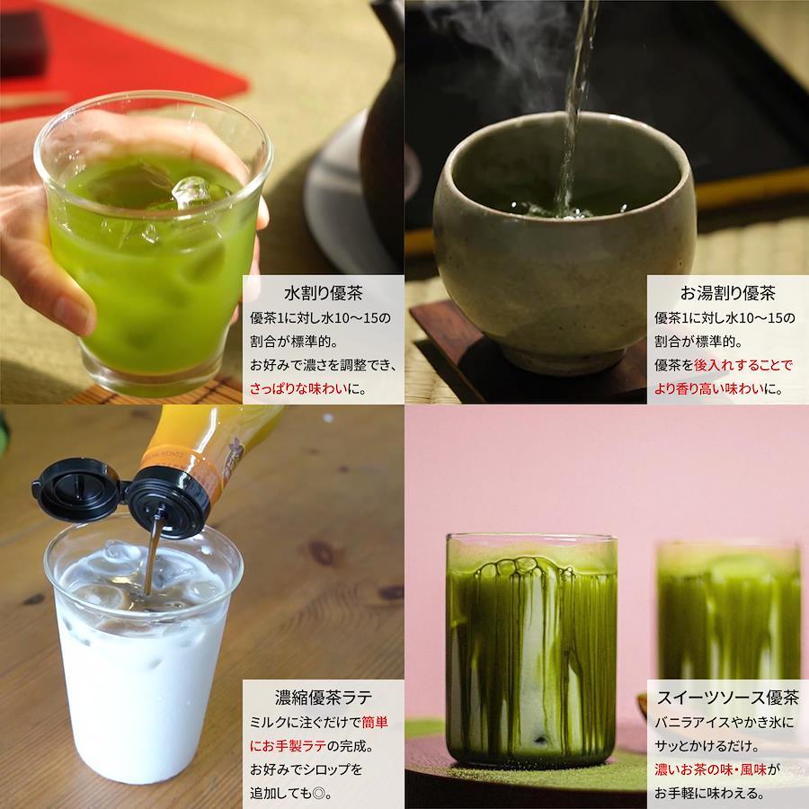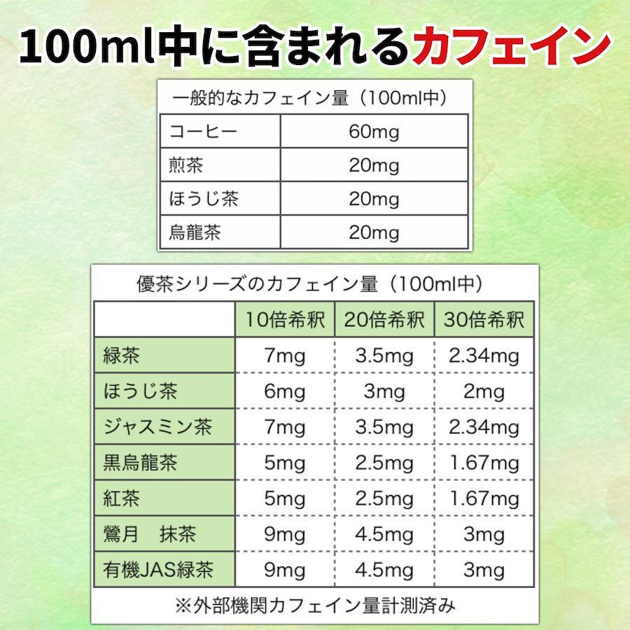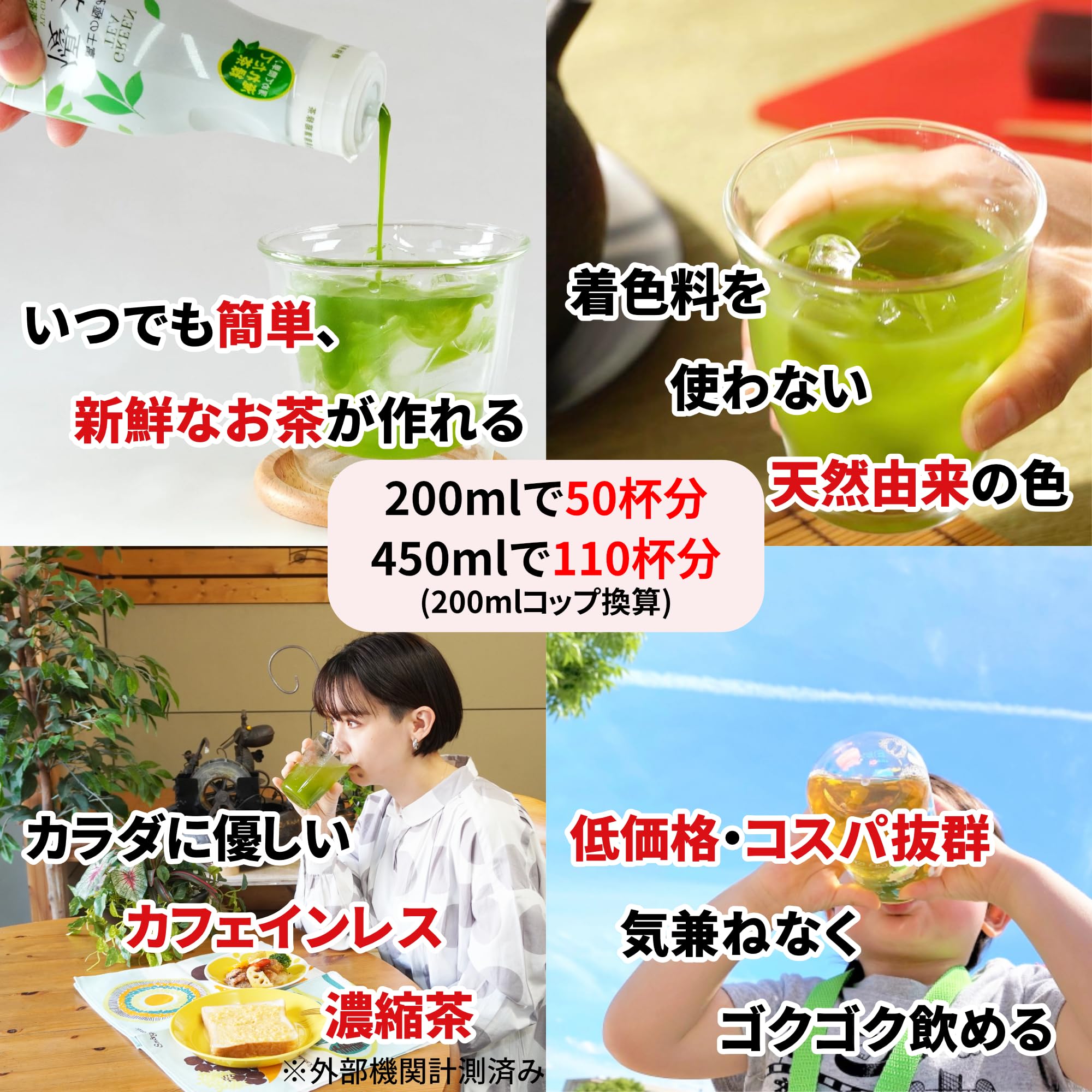 【商品情報】下の項目をご覧ください。※味の濃さ・香りにおいて香料を使用してない為、個人差はありますが薄く感じる場合がございます。【富士の極み優茶シリーズについて】①茶葉の有効成分を「まるごと」美味しく摂取していただくために特許技術で茶葉の旨み・甘みを逃すことなく、添加物に頼らない天然由来成分で濃縮(無添加・無着色)。無農薬や素材にこだわり、薄めても成分そのままに飲むことができます。②1本で約110杯分作れます。(本製品4mlを120mlの水で薄めた場合)濃縮茶だから濃くしたり、薄めたり、自分好みの味でアレンジもできます。③体に優しいカフェインレスの濃縮茶は、身体の状態を気にかけている方、ご妊娠・授乳中の方、小さなお子様からお年寄りまで幅広い世代の方に安心してお召し上がりできます。(外部機関カフェイン量計測済み)④茶に含まれる高濃度カテキンは体の状態を気にかけている敏感な方にもおすすめです。⑤真空プッシュボトル(エアレスハクリボトル)採用で開封後も空気に触れにくく、茶殻・茶粉が出ないサラサラとした液体濃縮(リキッド)賞味期限は約2年近く長持ちします(未開栓の場合)⑥液体だから急須を使用せず、水やお湯を注ぐだけで、栄養をまるごと簡単にいつでも新鮮なお茶が楽しめます。お茶っ葉が出ないので面倒な後片付けもなくゴミも出ません。⑦マイボトルを使用し茶を作ることで、本来捨てられてしまうペットボトルを削減し、環境にも優しい優茶です。⑧商品詳細:【シリーズ】富士の極み 優茶、【サイズ】H約22.0×W約6.5cm、【素材】緑茶、【内容量】450ml、【原産国】静岡県産、【カフェインタイプ】カフェインレス、【化粧箱】なし【ご使用上の注意点】:高温場所を避けて暗所に保管してください。開栓後は冷蔵庫に保管し、お早めにお召し上がりください。茶葉に由来する成分が浮遊、沈澱する事がありますが、品質には問題ありません。【ご購入に関するお願い】仕様が予告なしに変更する場合がございます。お使いのモニターにより、実際の商品と色味が異なる場合がございます。【免責事項】メーカーによる商品リニューアルに伴いパッケージ(内容量も含む)変更が行われた場合、新パッケージでお届け致します事ご了承願います。