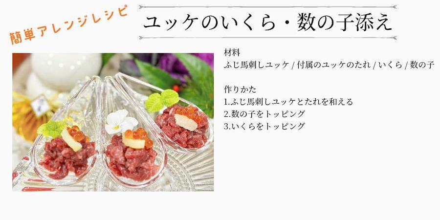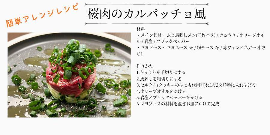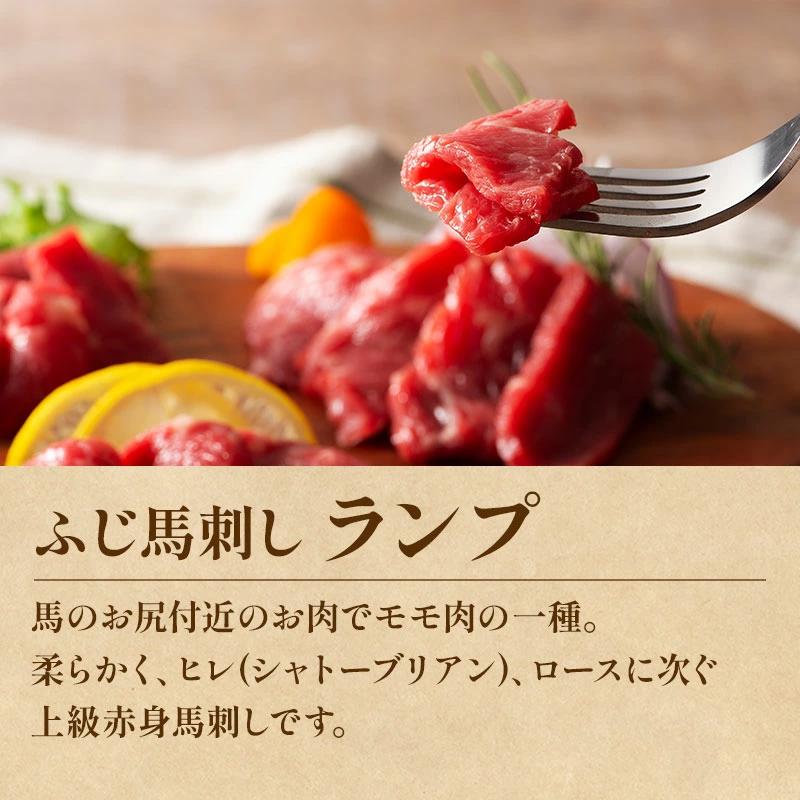 | 原材料名 | 馬肉、牛肉 馬刺しのたれ原材料:しょうゆ(国内製造)、植物性蛋白加水分解物(大豆を含む)、糖類(砂糖、砂糖混合異性化液糖)、食塩、かつお節エキス(小麦・さばを含む)/カラメル色素、調味料(アミノ酸等)、甘味料(ステビア、カンゾウ) 馬刺し生姜原材料:しょうが(国産、中国)、食塩/増粘多糖類、酸化防止剤(ビタミンC) たたきのたれ原材料:しょうゆ(国内製造)、醸造酢、砂糖、にんにく加工品、こしょう、赤唐辛子/調味料(アミノ酸等)、(一部に小麦・大豆を含む) |