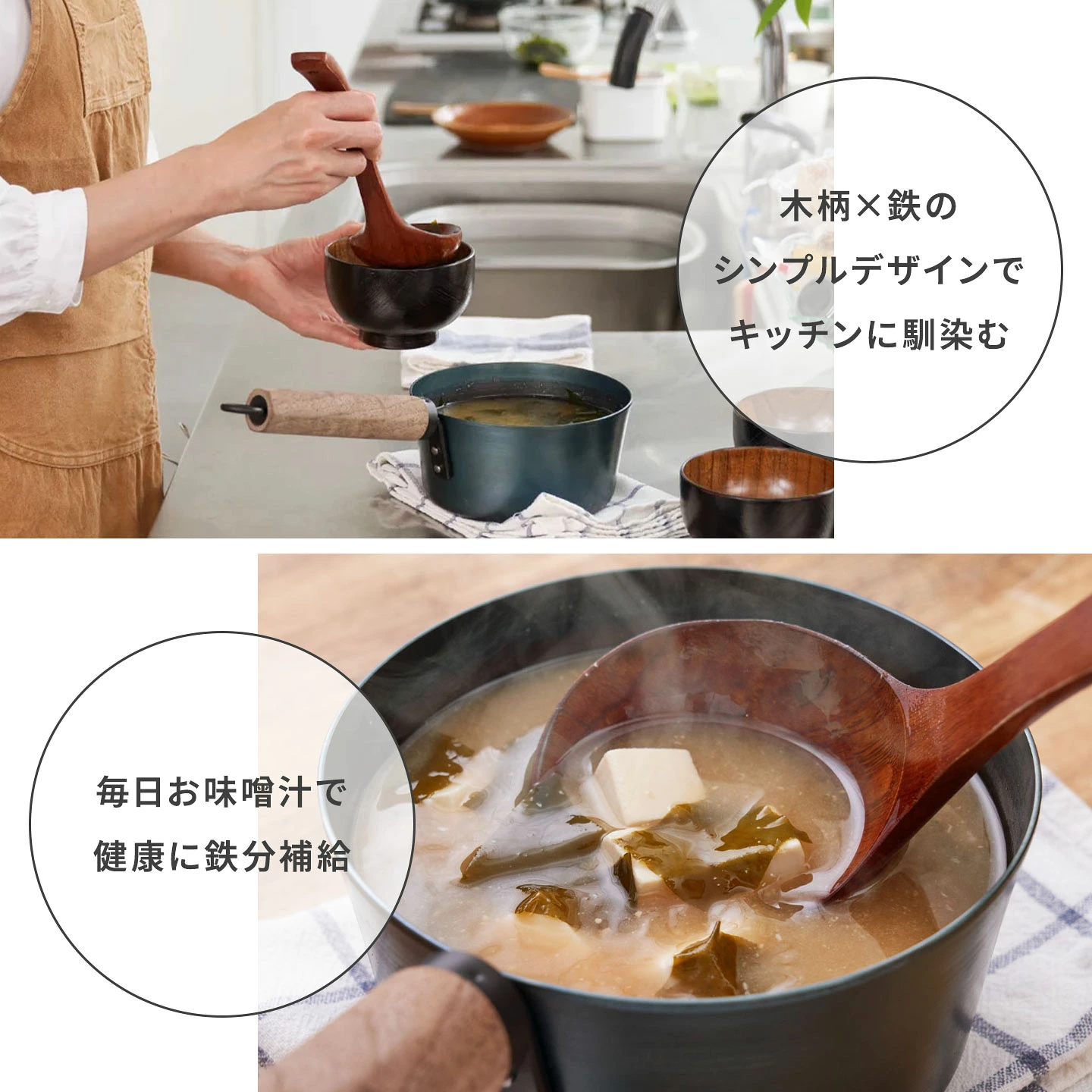 Fujita Metal's 16cm Miso Soup Pan, Made in Japan, IH/Gas Compatible, Lightweight Iron Pot for Miso Soup, Single-Handed Pot, Ironware, Frying Pan, Iron Supplement, Anemia Relief, Easy Care, Stylish, Simple Design, Walnut, Beech, Natural Wood [avd-fpan05]