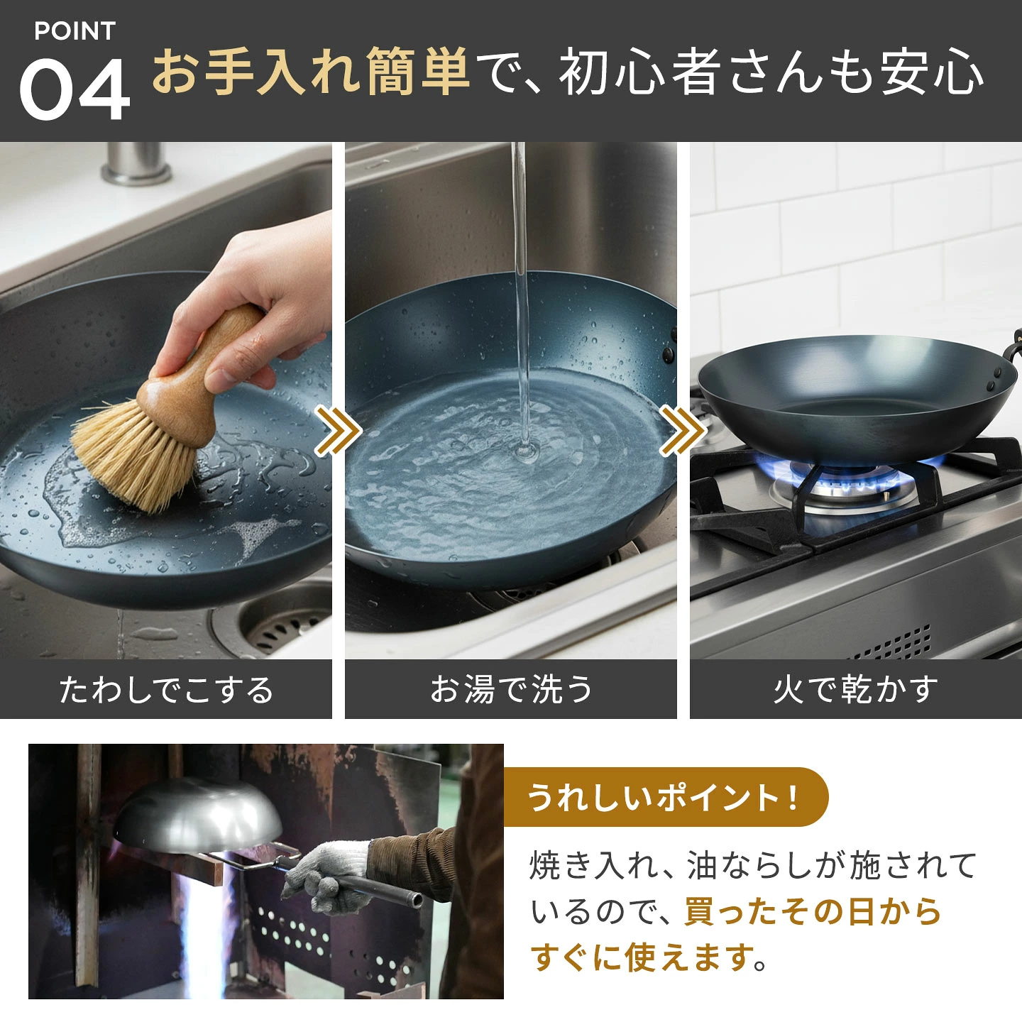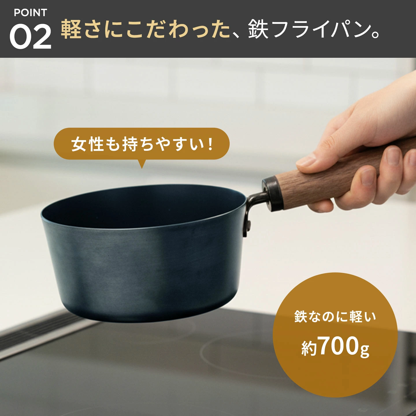 買ったその日からすぐ使えるように、職人がひとつひとつ手作業でシーズニング(焼き入れ・油ならし)を施した状態でお届けします。正しい使い方とお手入れ方法をまとめた「お手入れマニュアル」も同封しているので、初めての鉄フライパンでも安心です。鉄フライパンは、丁寧に使い続けるほど育ち、長く愛用できるのが魅力。また、鉄なのにとても軽く、女性でも扱いやすい重量に仕上げました。持ち手には、持ちやすさを追求した六角グリップを採用し、手にしっかりフィットします。木柄×鉄のシンプルなデザインはどんなキッチンにも馴染み、毎日の料理がちょっと楽しくなる佇まいです。ガス火・IHなど幅広い熱源に対応しています。そして、鉄フライパンならではの魅力は “鉄分補給ができること”。毎日のお味噌汁づくりや普段の調理で、手軽に鉄分チャージを習慣にできます。ボックス付きでギフトにもオススメです◎