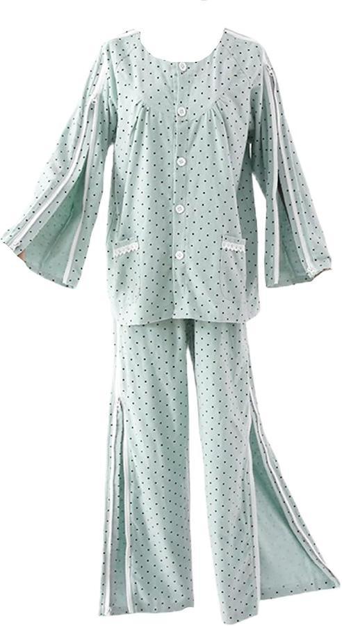 介護用パジャマは、ファスナーと面ファスナーで着脱しやすいレディース用の上下セット。