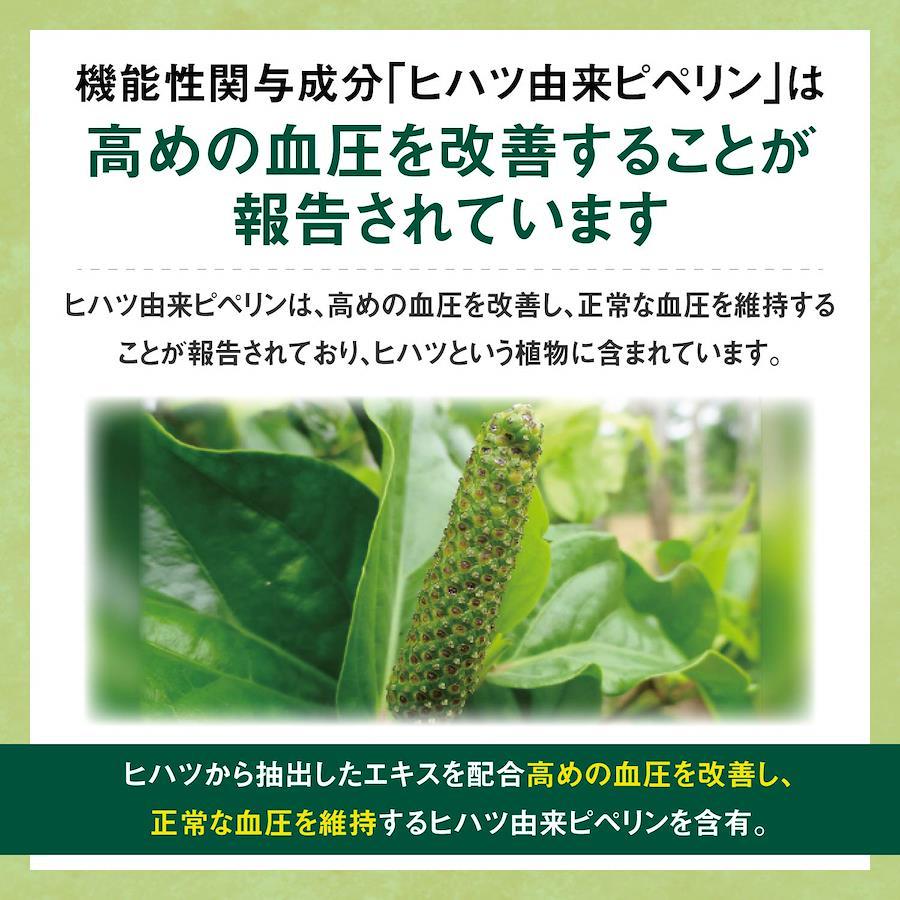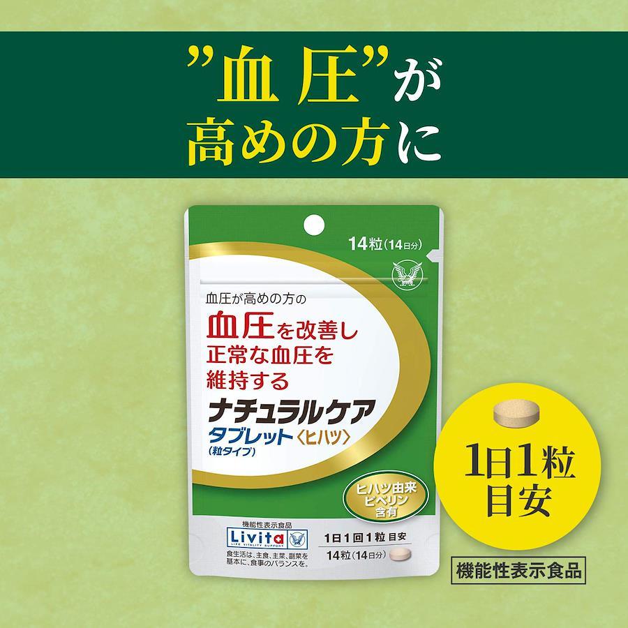 ■サイズ:??14.9x10x1.5cm;9g●ナチュラルケアタブレット(粒タイプ)は、高めの血圧※を改善し正常な血圧を維持するヒハツ由来ピペリン配合です。 ●ヒハツ由来ピペリンは血管内でNO(一酸化窒素)の産生を促し、血管を拡張させることがメカニズムとして知られており、高めの血圧を改善することが報告されています。 ●ヒハツはコショウ科の植物で、その果実はスパイスや調味料として、昔から国内外で食されてきました。 ※「高めの血圧」とは、収縮期血圧130mmHg~139mmHg、または拡張期血圧85mmHg~89mmHgのことです。 [届出表示] 本品にはヒハツ由来ピペリンが含まれています。ヒハツ由来ピペリンには、血圧が高めの方の血圧を改善し、正常な血圧を維持する機能があることが報告されています。 [届出番号] D11 機能性表示食品 届出番号:D11 商品サイズ (幅×奥行×高さ) :10cm×1cm×15cm 内容量:14粒 ■重要なお知らせ原材料・成分ヒハツ抽出物(デキストリン、ヒハツエキス)、還元麦芽糖水飴/結晶セルロース、カルボキシメチルセルロースカルシウム、微粒酸化ケイ素、ステアリン酸カルシウム 機能性関与成分 1粒(300mg)当たり ヒハツ由来ピペリン90μg