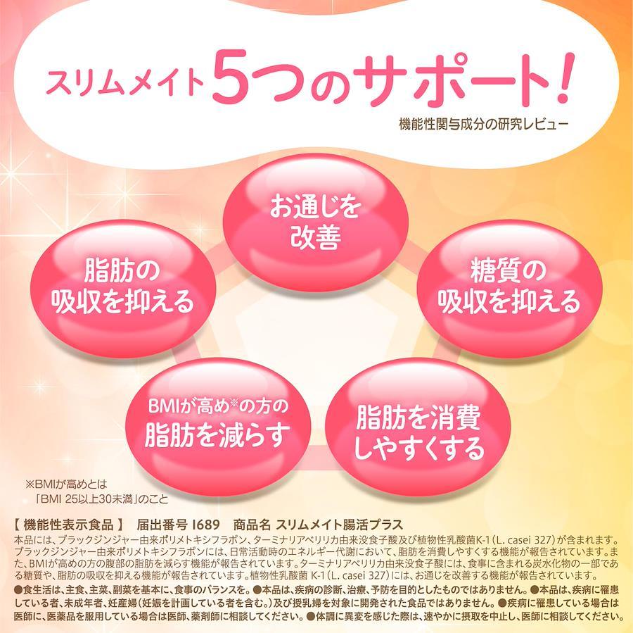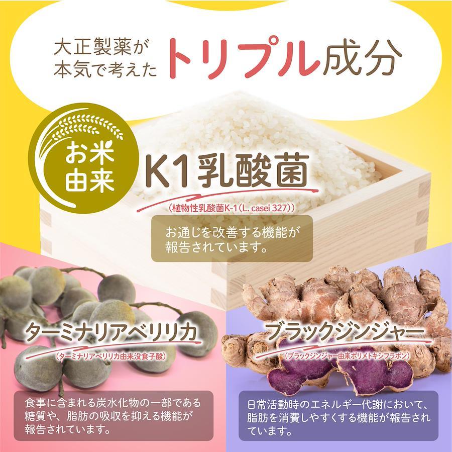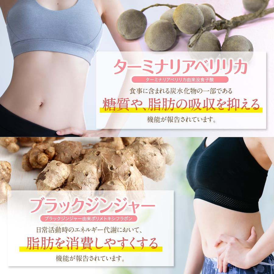 本品には、ブラックジンジャー由来ポリメトキシフラボン、ターミナリアベリリカ由来没食子酸及び植物性乳酸菌K-1(L. casei 327)が含まれます。 ブラックジンジャー由来ポリメトキシフラボンには、日常活動時のエネルギー代謝において、脂肪を消費しやすくする機能が報告されています。 また、BMIが高めの方の腹部の脂肪を減らす機能が報告されています。 ターミナリアベリリカ由来没食子酸には、食事に含まれる炭水化物の一部である糖質や、脂肪の吸収を抑える機能が報告されています。 植物性乳酸菌 K-1(L. casei 327)には、お通じを改善する機能が報告されています。