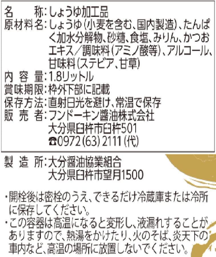 原材料:しょうゆ(小麦を含む、国内製造)、たんぱく加水分解物、砂糖、食塩、みりん、かつおエキス/調味料(アミノ酸等)、アルコール、甘味料(ステビア、甘草)