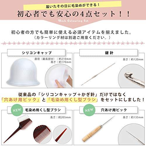 【抜群のコストパフォーマンス!】使うたびに3,000円以上の ヘアカラー にかかる出費を削減!!お金をかけずに簡単に カラーリング を楽しめます。 【隙間時間を有効活用!】好きな時間に好きなだけ!繰り返し使えるシリコン製 毛染めキャップなので メッシュ や ハイライト をはじめいろいろなアレンジヘアーを楽しめます。 【初心者でも安心!】届いたその日に使える 自宅でできる メッシュカラー 4点セット!プロ直伝のイラストガイド付きだから、セルフカラー が初めての方でも迷わずご使用いただけます。 【めんどうなお悩みを解消!】シリコン製 メッシュキャップ の“穴あけ専用ピック”をご用意しました。「穴あけ作業が難しくてめんどくさい!」のお悩みを解消しました。 【45日間返品交換保証!】ご購入から45日間適応!ご返送料は当社負担!全額返金対応も可能!本製品は日本企業が販売、品質管理を行なっております。アフターサポートも日本人スタッフが迅速かつ丁寧に対応させていただきます。