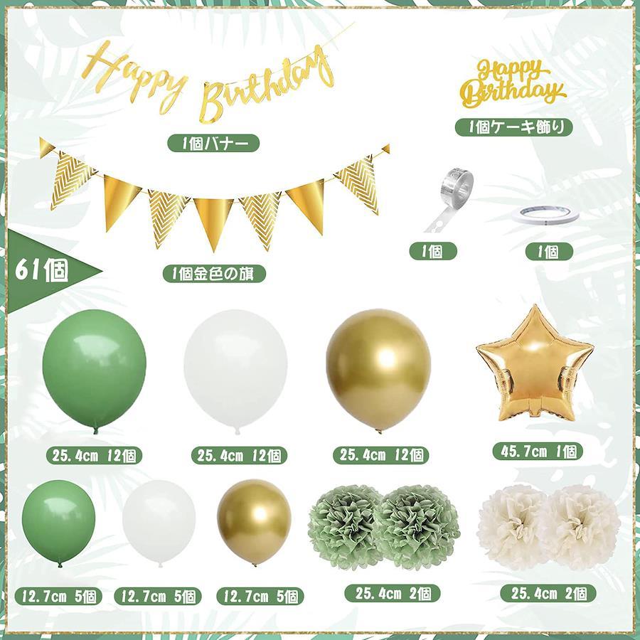 【誕生日 飾り付け セット内容 】"Happy Birthday" バナー×1個、フラッグガーランド×1個、星の風船×1個(ゴールデン)、10インチのラテックスバルーン×36個(グリーン、ホワイト、ゴールド)、5インチのラテックスバルーン×15個(グリーン、ホワイト、ゴールド)、 両面テープ×1巻 、バルーンストリップ X1個 、ペーパーフラワーx4個、Happy Birthday ケーキインサート1個 。【安全で無毒な】天然ゴムラテックス製、 加厚加工、極厚タイプで破れにくく、環境や人体に安全で無毒・無害の材料で作られたので、お子様も安心して遊べます。対象:6歳以上【リサイクル可能】両面テープで壁に貼付けるだけで簡単に装飾できます。剥がしやすく、壁を傷めにくいので大変便利で。パーティー終わたら、ちゃんと収納して、次のパーティーやお部屋の飾り付けとして再利用も可能です。【適用場合】誕生日パーティー、結婚式、特別な祝日、二次会いろんな記念日、普段お部屋の飾り、インテリア、お店の飾りなどにも適用。 室内はもちろん、お庭や野外でのパーティー・イベントでもご利用頂けます;パーティーの会場を装飾でき、パーティーの後にも子供たちの部屋の飾り付けとして持続に使用できます。【アフターサービス】安心の30日間品質保証、製品や使用に関する任意の問題がございましたら、いつでもご遠慮なく直接に弊社までご連絡ください。24時間内に返事いたします。【免責事項】メーカーによる商品リニューアルに伴いパッケージ(内容量も含む)変更が行われた場合、新パッケージでお届け致します事ご了承願います。