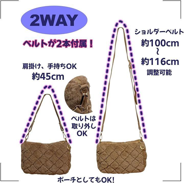 ・ファー仕様のキルティングバッグは先端がフック仕様になっている、長めのベルトと短めのベルトが付属。