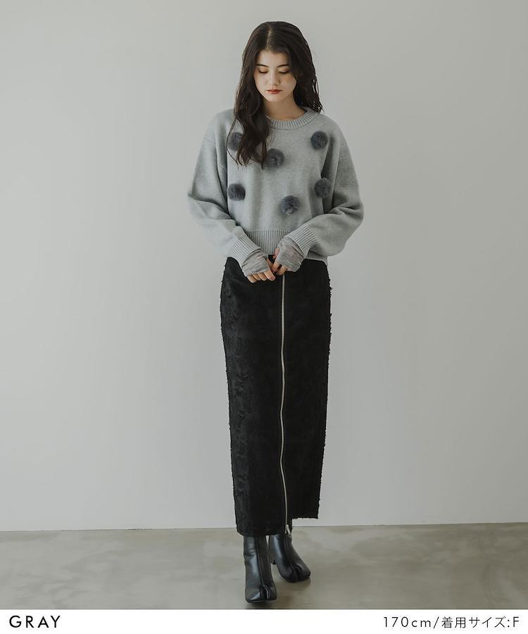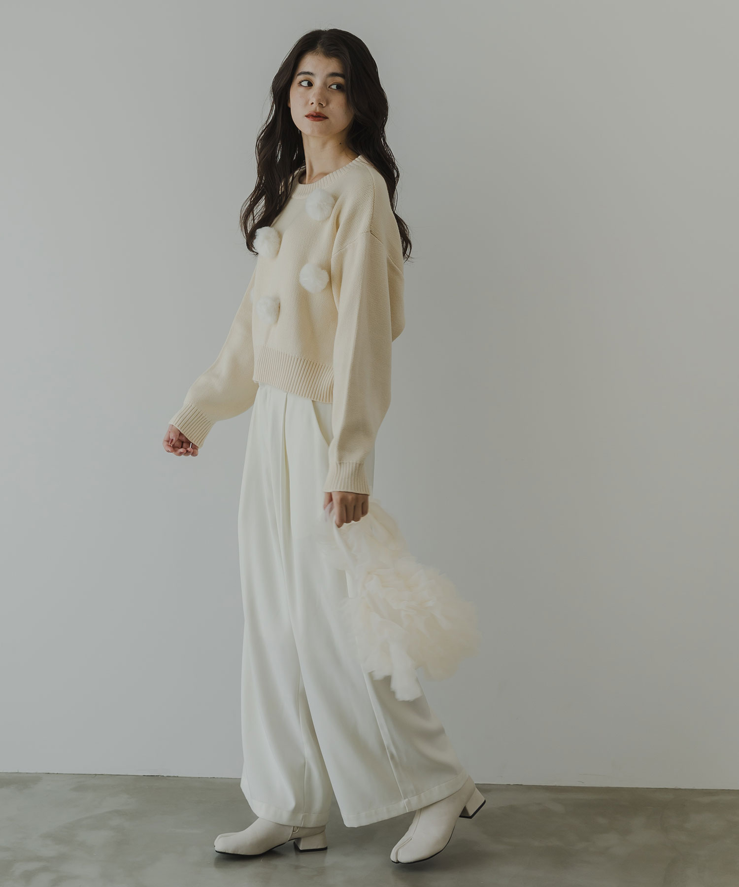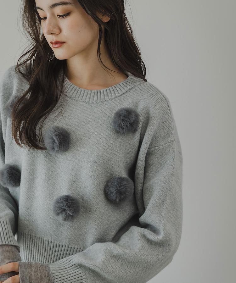 もちもちとした肌触り抜群のニットに思わず触れたくなるファーポンポンをあしらったニットプルオーバー。