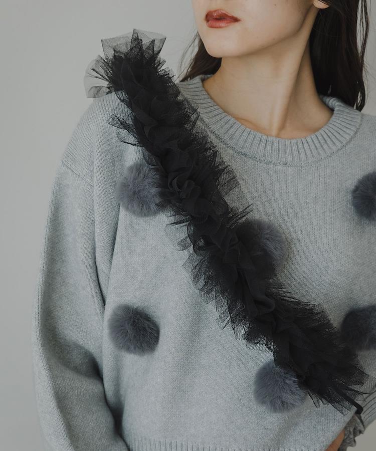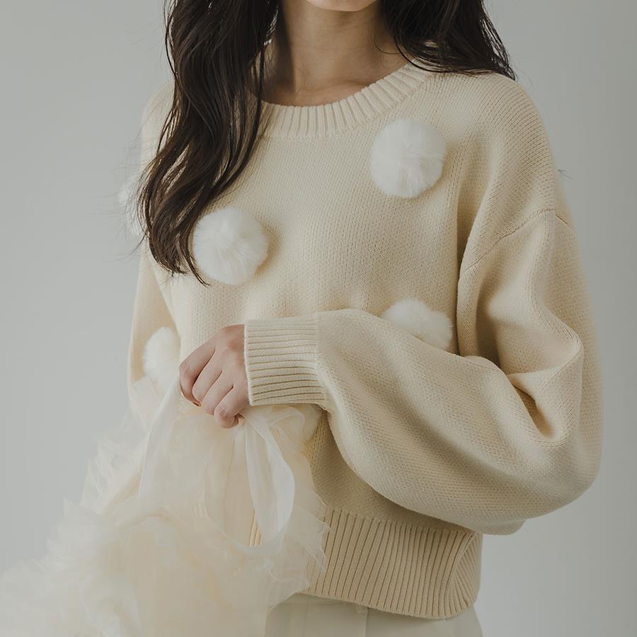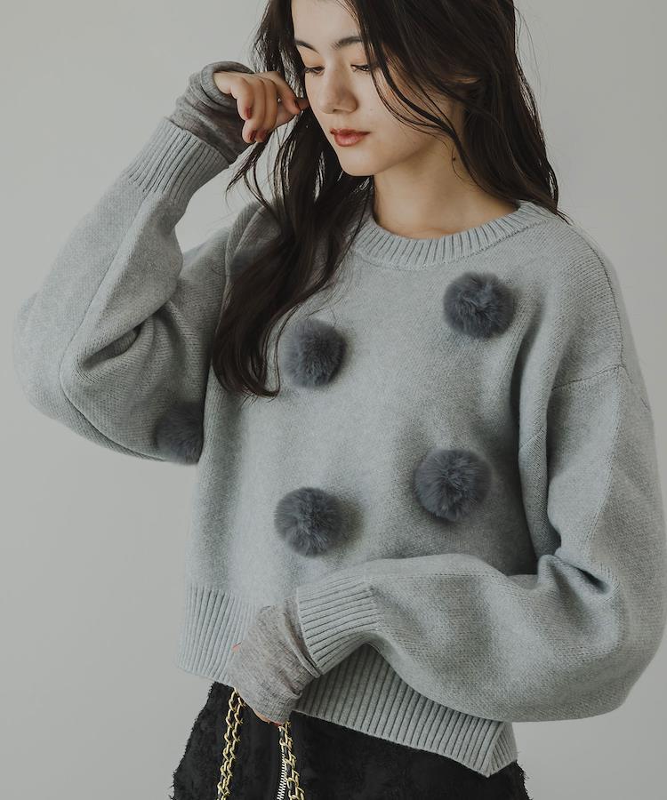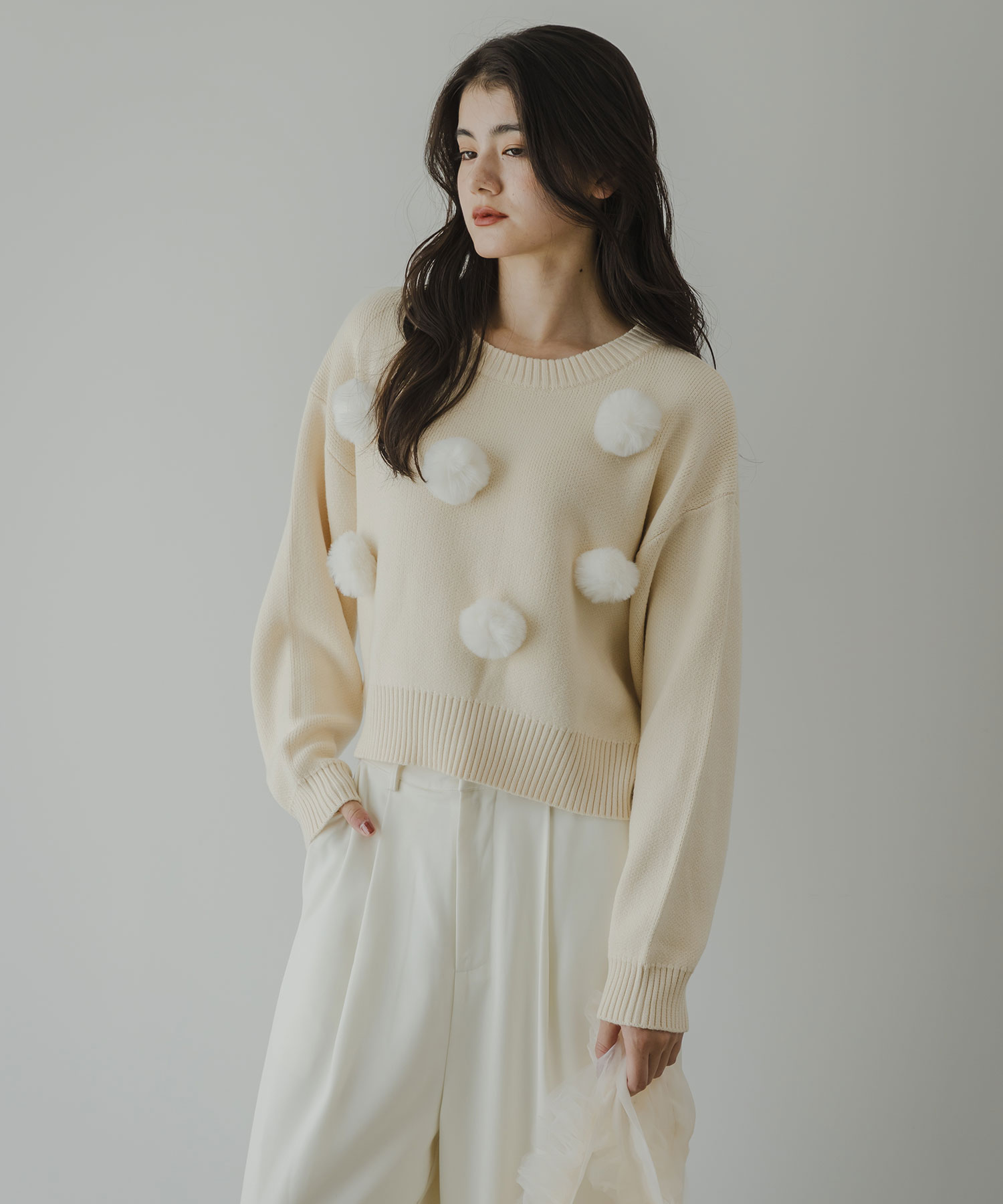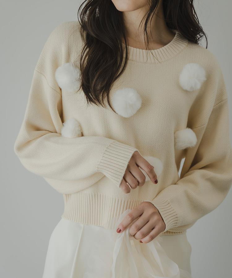 もちもちとした肌触り抜群のニットに思わず触れたくなるファーポンポンをあしらったニットプルオーバー。