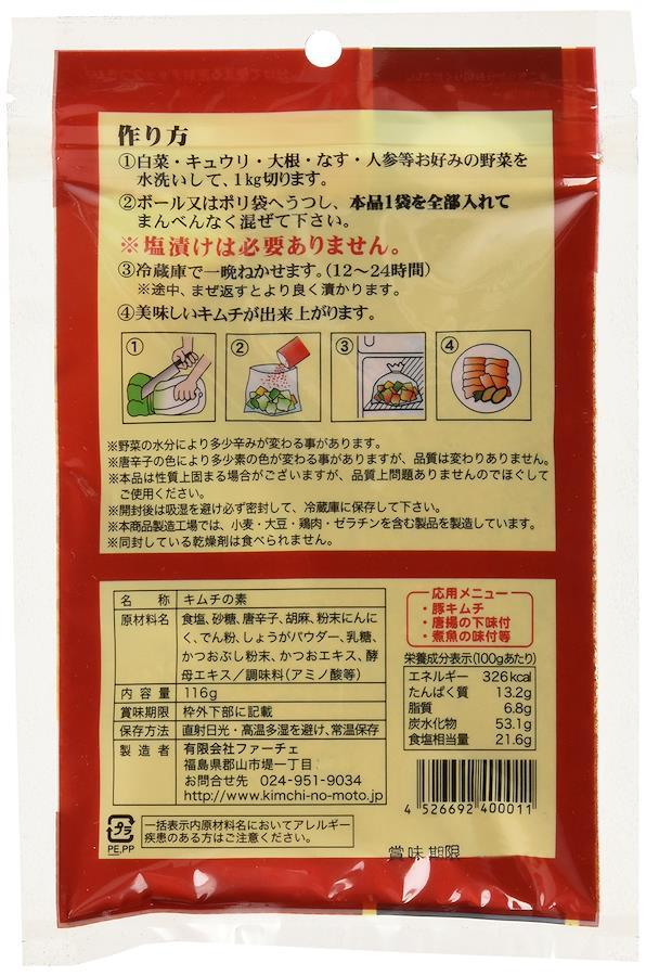 切ってまぜるだけ! 白菜(約1kg分)を切って、1袋混ぜ合わせ、冷蔵庫で一晩寝かせれば出来上がりです。 手作りキムチ専門店が作った自宅で簡単! キムチの素シリーズです。 塩漬けなど一切必要ありません。ただ白菜などの野菜を切って混ぜるだけです。
