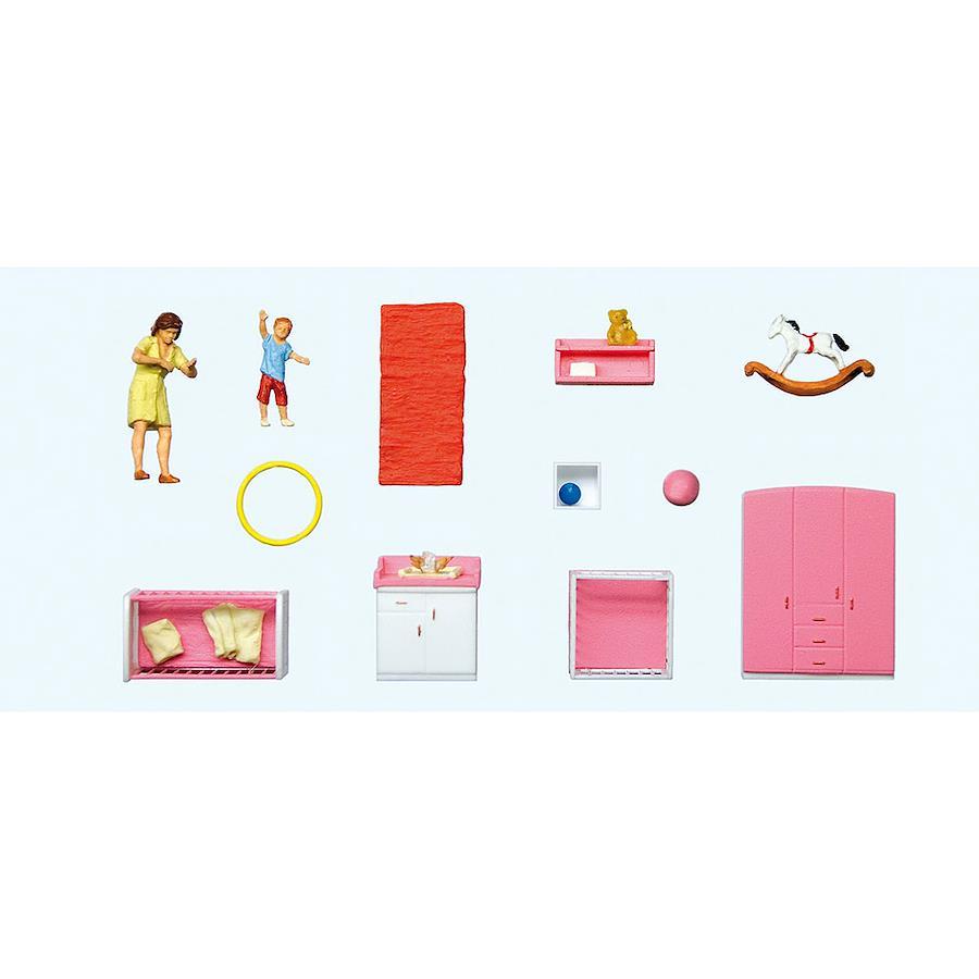Mother changing diapers.Nursery furniture赤ちゃんのおむつを替えているお母さんと、あやそうとしている上の子とベビー寝具のセットです。ベビーベットにクローゼット、木馬やボールにフラフープなどの小物も揃っています!