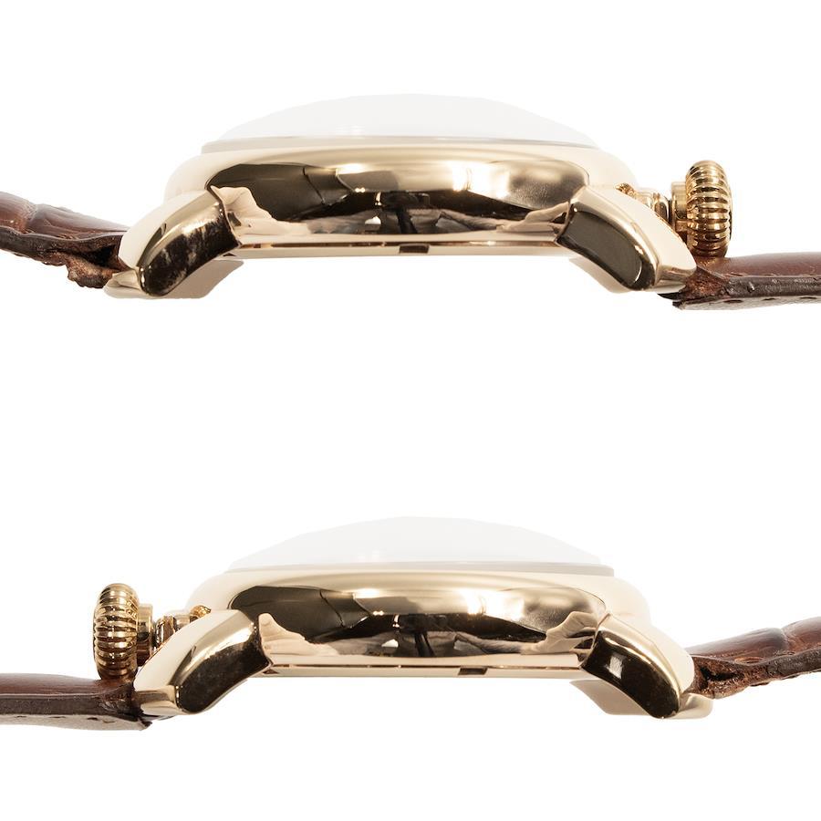 肌なじみの良いピンクゴールドのケースが、ブラックの文字盤を格調高く引き立てております。