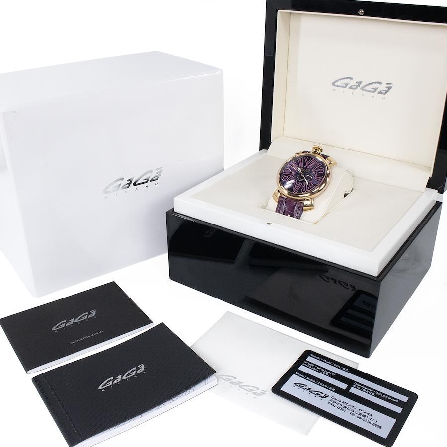こちらは光沢あるパープルカラーが目を惹きます、ガガミラノの腕時計でございます。