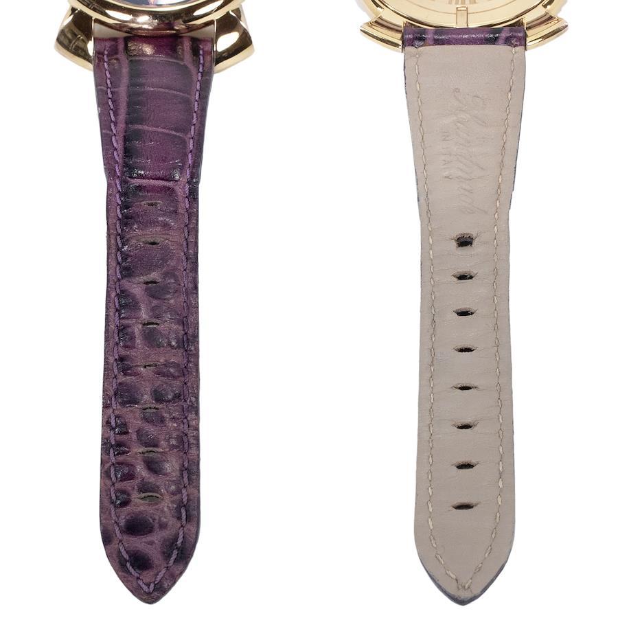 メタリックな輝きを放つパープルの文字盤と、華やかなピンクゴールドのケースが、腕元に色気と高級感を添えます。