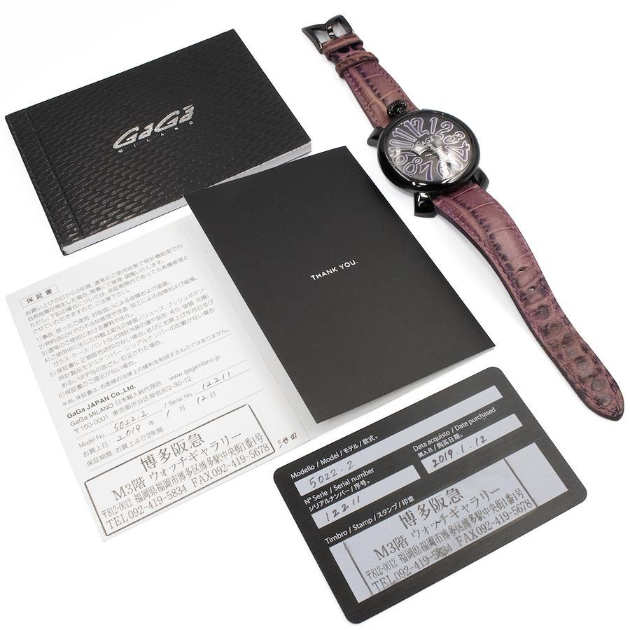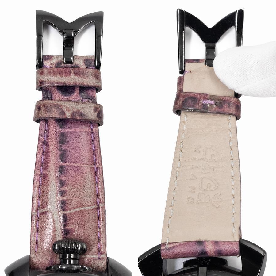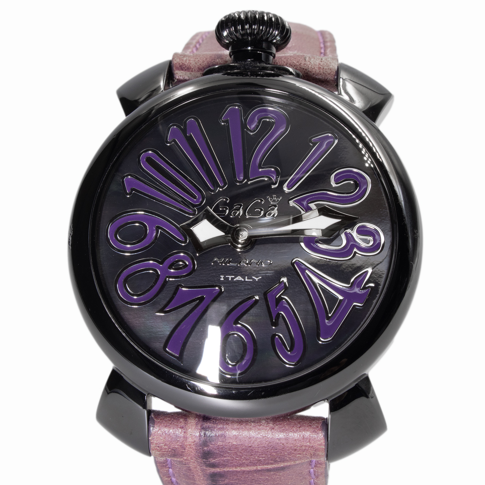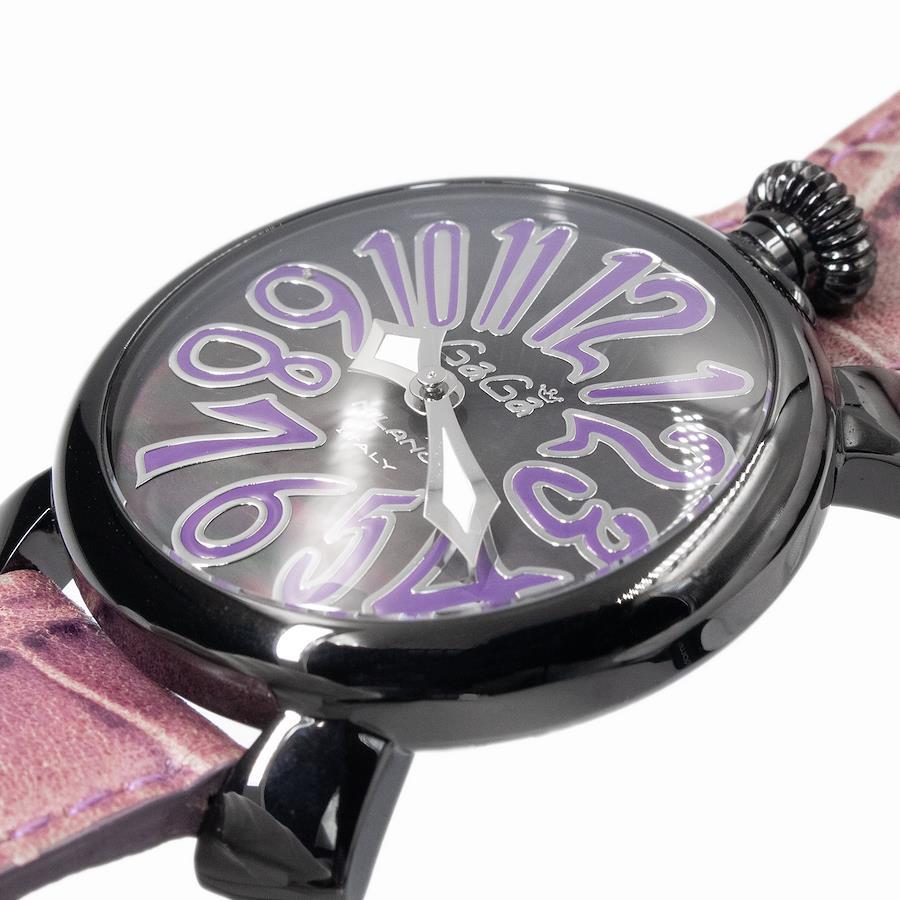 こちらは黒蝶貝の上で紫の数字が踊るように時を刻む、ガガミラノの腕時計でございます。