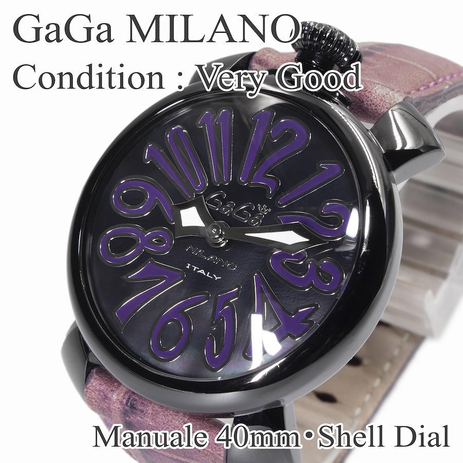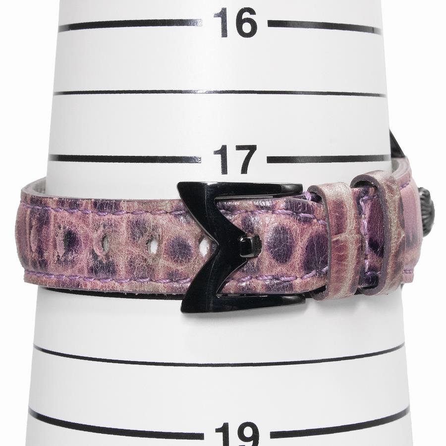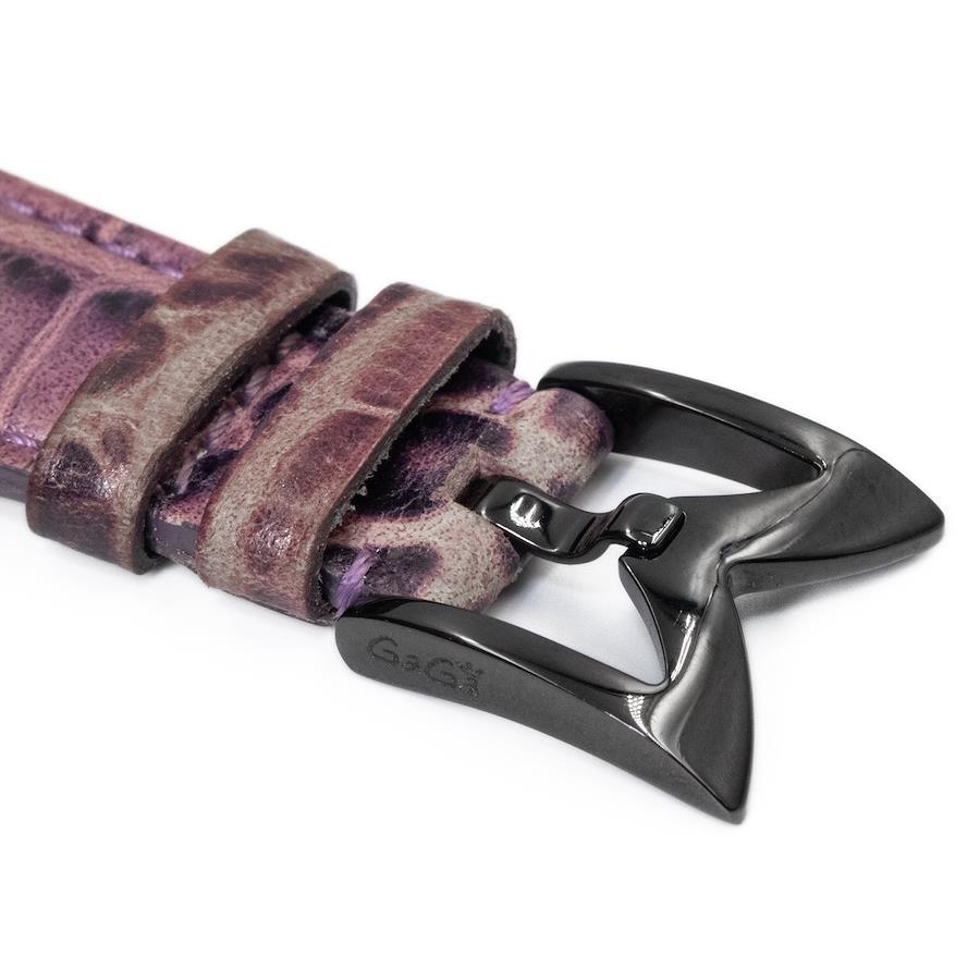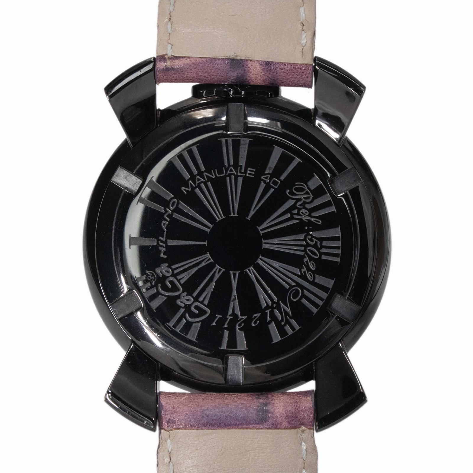 こちらは黒蝶貝の上で紫の数字が踊るように時を刻む、ガガミラノの腕時計でございます。
