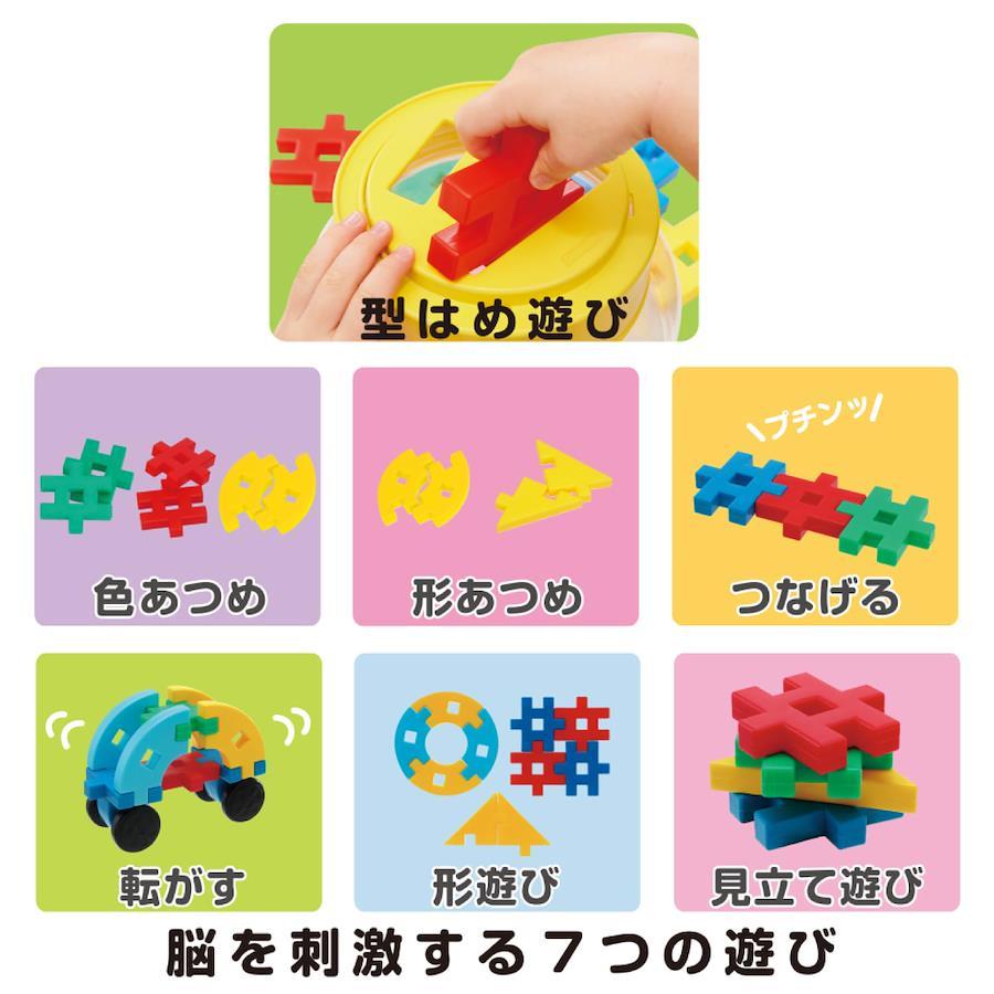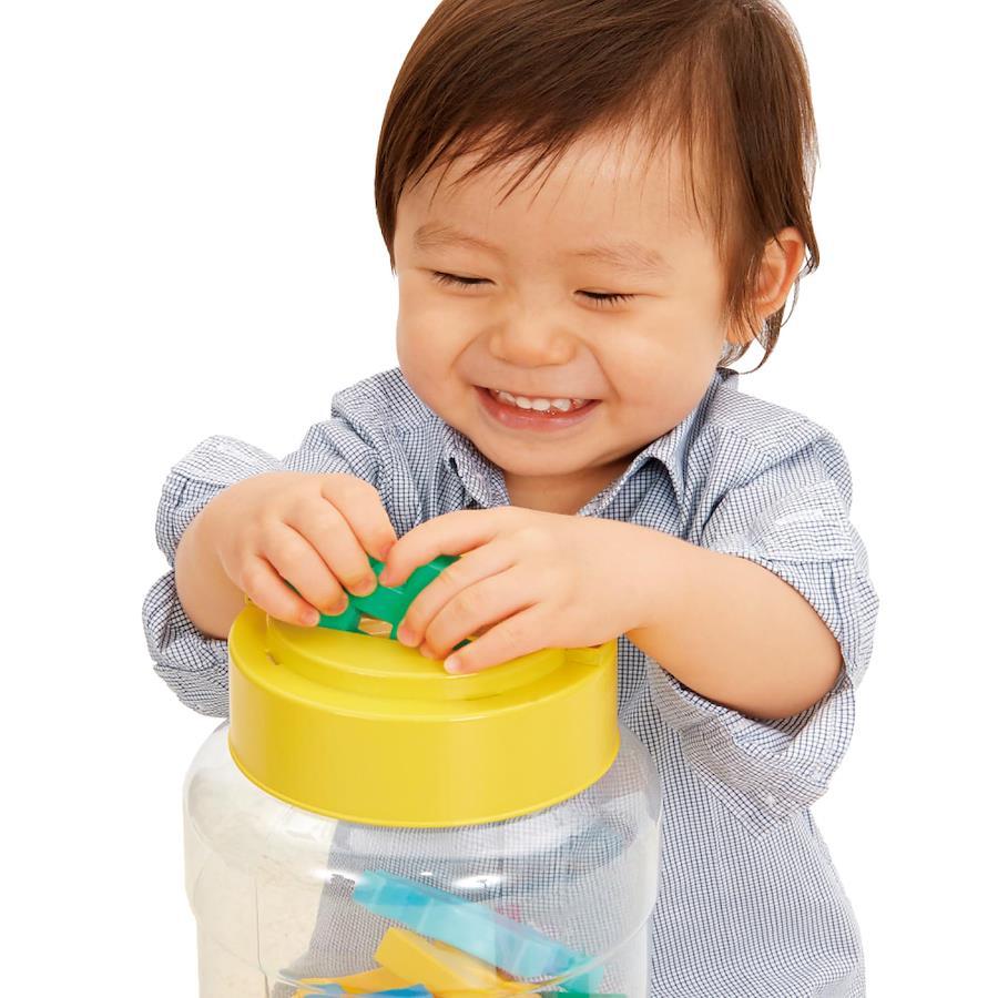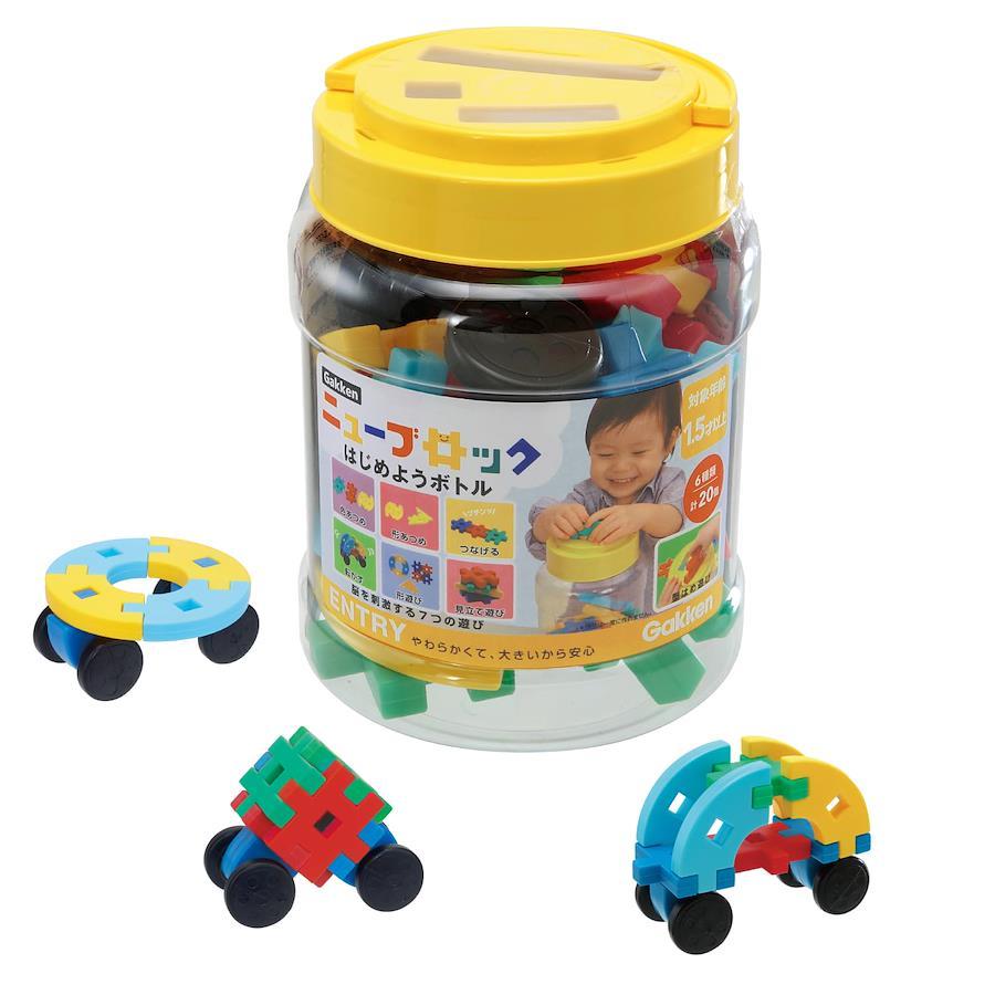 遊び方無限のニューブロックは、お子さまの「創造性」を刺激し、豊かな「経験」をつくります。 ニューブロックの特長 ・やわらかくて大きいから安心・・・やわらかいから踏んでも投げても痛くない、大きいから誤飲の心配のない安心設計。 ・創造力を育む特徴的な形・・・「つなぐ」「はさむ」「さしこむ」など様々な組み方ができ、創造力や認知力を育みます。 ・成長に合わせて長く遊べる・・・見立て遊びやごっこ遊び、大きな作品づくりまで1.5歳から小学生になっても遊べます。 「Gakkenニューブロック はじめようボトル」は、型はめ遊びができるボトルのセット。ふたの部分に空いている3種の大きさの穴にパーツを落とすことで形や大きさの認識力を養うことができます。また、指先を使う、つなげる遊びや想像力を引き出す見立て遊びなど多様な遊びが楽しめます。