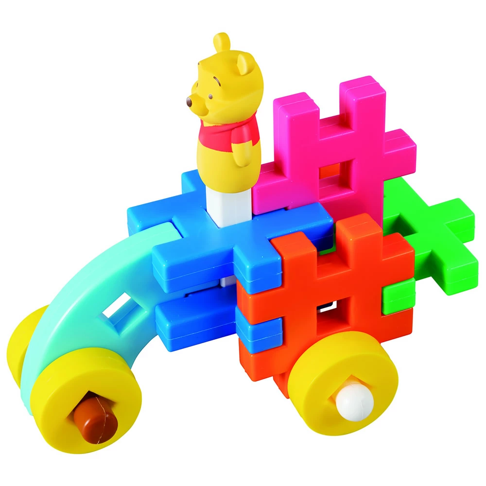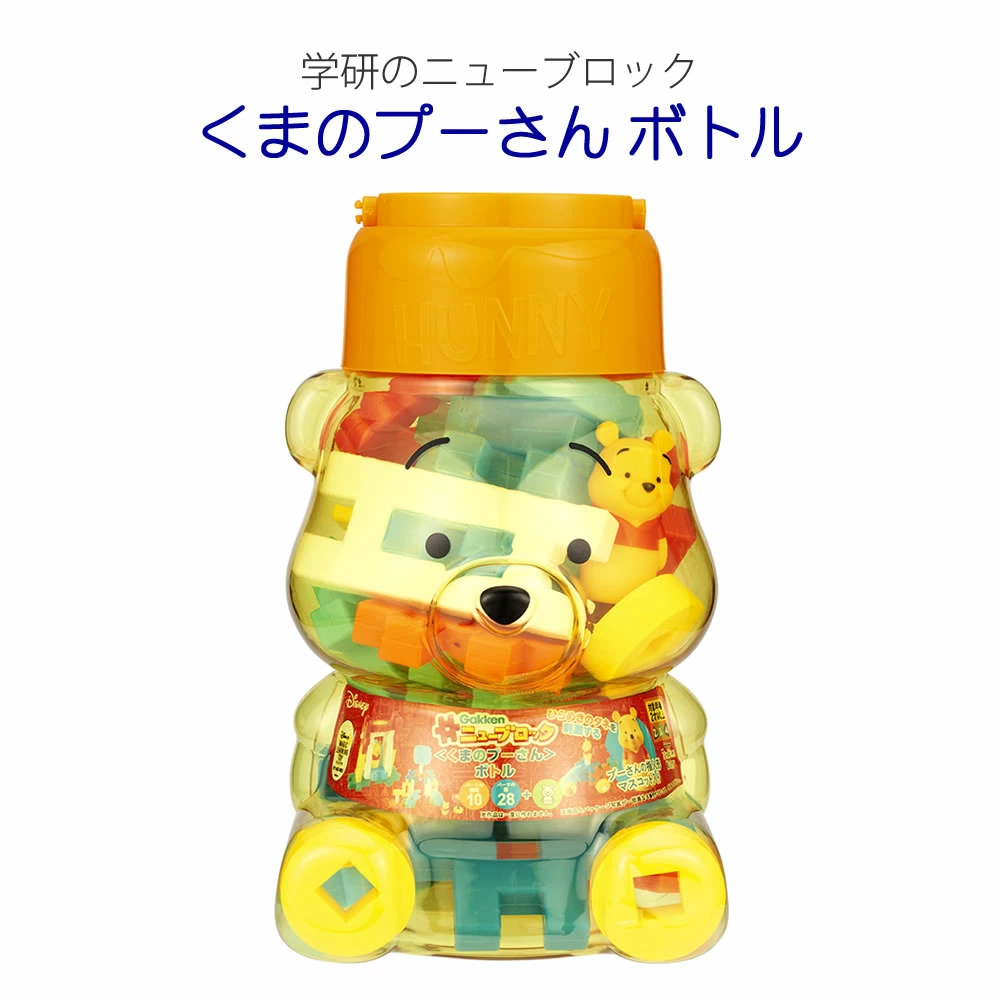 ・はちみつの壺を乗せたかわいいくまのプーさんの形をしたボトルにブロックとプーさんの指人形マスコットが入っています。・手に取りやすく、持ち運びにも便利なセット。・10種28パーツ+くまのプーさんマスコット