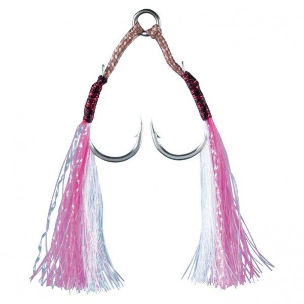 アシストフック自体がバイトマーカーとなり、軽比重マテリアルの吸い込みの良さとあいまって、フッキング率まで向上させます。ベイトは小さくてもターゲットは大型魚という、通常のライトタイプアシストフックでは太刀打ちできない状況にも対応するため太軸のフックを使用。オフショアのターゲットに幅広く適応します。